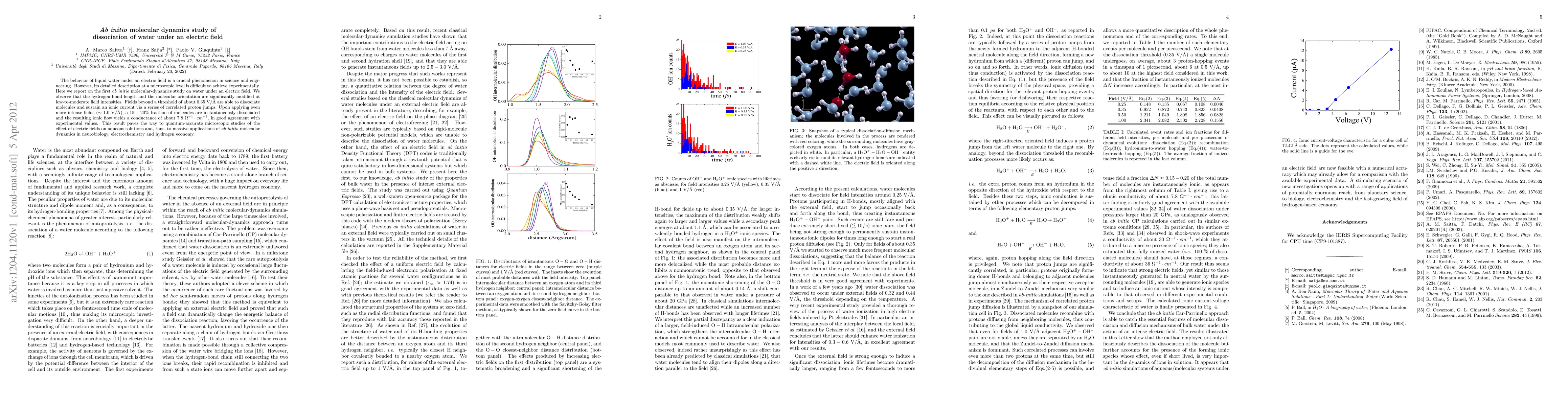 This study uses ab initio molecular dynamics to investigate water dissociation under electric fields, revealing significant modifications in hydrogen-bond lengths and molecular orientation at moderate fields, and complete dissociation and ionic conductance at higher intensities, aligning well with experimental data.