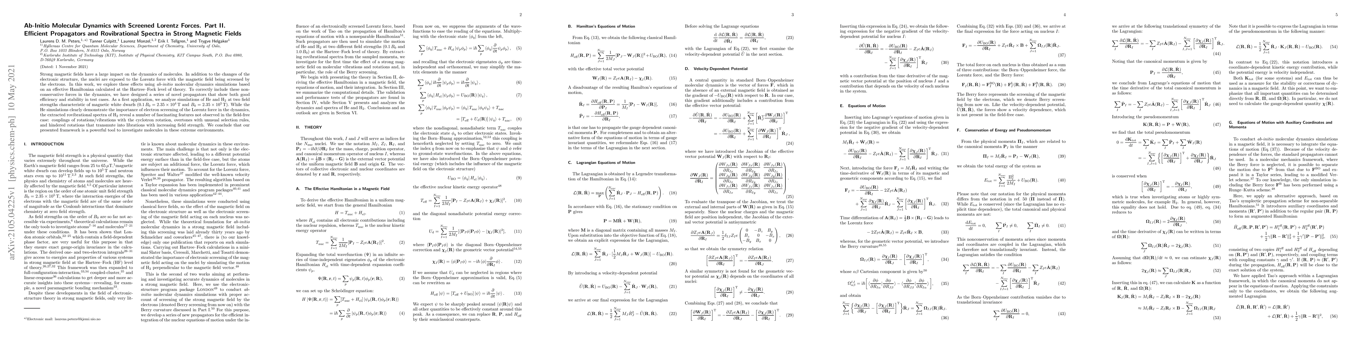 This paper explores the impact of strong magnetic fields on molecular dynamics using ab-initio molecular dynamics simulations. It introduces efficient propagators for screened Lorentz forces and analyzes rovibrational spectra of He and H$_2$ in magnetic fields typical of magnetic white dwarfs, revealing novel coupling and selection rule effects.