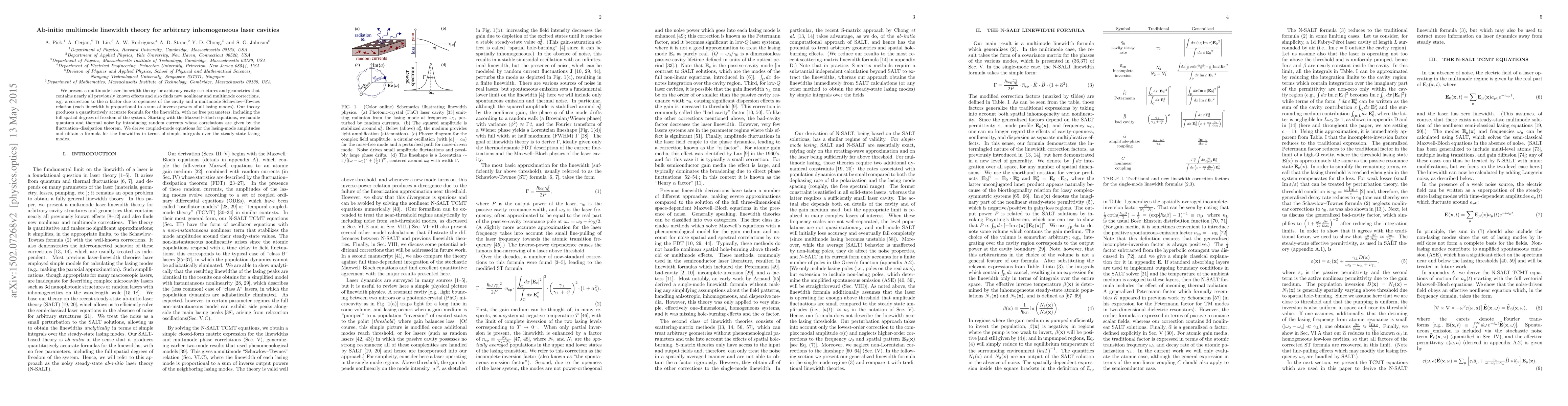 This paper develops a comprehensive multimode laser-linewidth theory for arbitrary cavity structures, incorporating both known and new nonlinear and multimode corrections. It provides a quantitatively accurate linewidth formula without free parameters, derived from the Maxwell-Bloch equations and accounting for quantum and thermal noise.