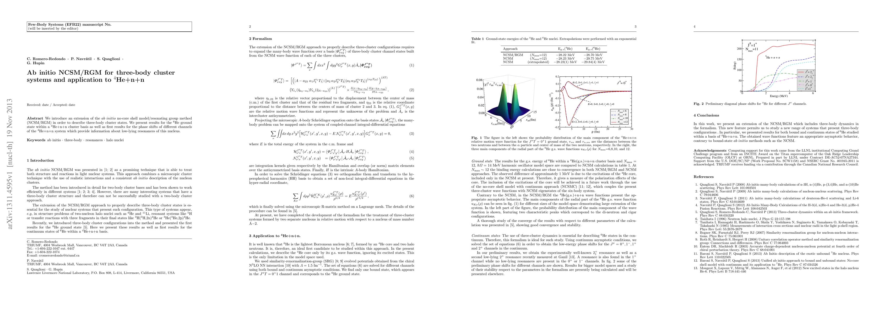The research introduces an extension of the ab initio NCSM/RGM to describe three-body cluster states, applying it to the $^4$He+n+n system, and presenting results for the $^6$He ground state within a $^4$He+n+n cluster basis, along with phase shifts for different channels of the $^4$He+n+n system to infer low-lying resonances of $^6$He.