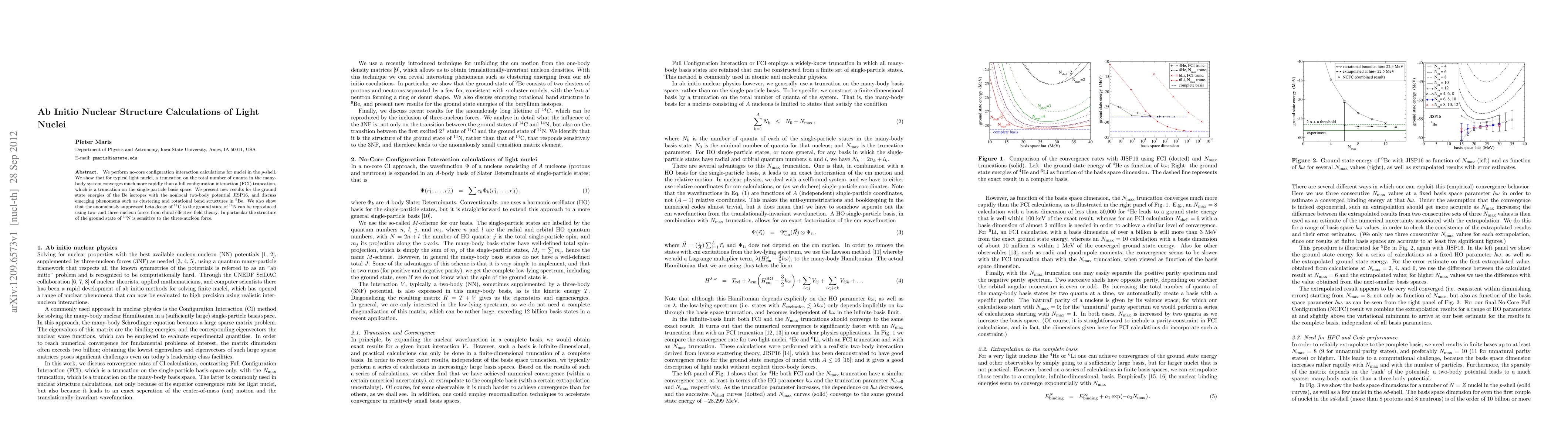We perform no-core configuration interaction calculations for nuclei in the p-shell. We show that for typical light nuclei, a truncation on the total number of quanta in the many-body system converges much more rapidly than a full configuration interaction (FCI) truncation, which is a truncation on the single-particle basis space. We present new results for the ground state energies of the Be isotopes with the nonlocal two-body potential JISP16, and discuss emerging phenomena such as clustering and rotational band structures in 9Be. We also show that the anomalously suppressed beta decay of 14C to the ground state of 14N can be reproduced using two- and three-nucleon forces from chiral effective field theory. In particular the structure of the ground state of 14N is sensitive to the three-nucleon force.