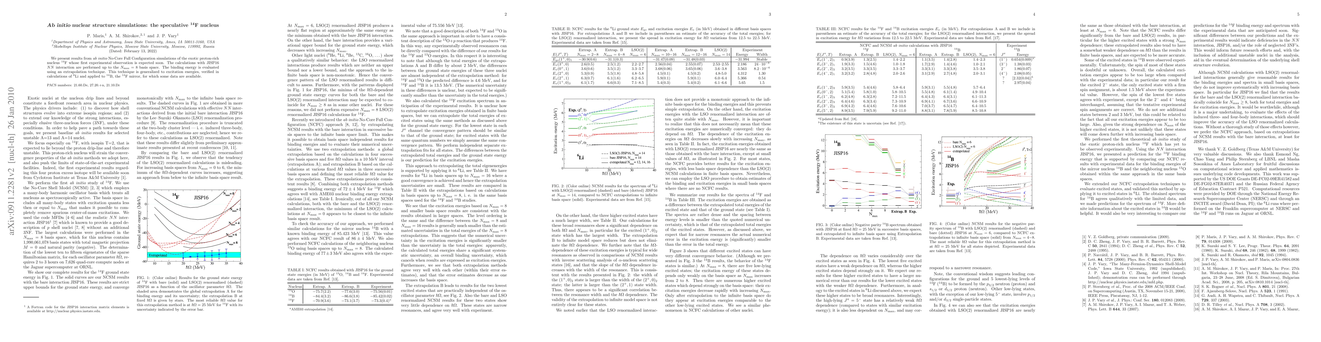 We present results from ab initio No-Core Full Configuration simulations of the exotic proton-rich nucleus $^{14}$F whose first experimental observation is expected soon. The calculations with JISP16 NN interaction are performed up to the $N_{\max}=8$ basis space. The binding energy is evaluated using an extrapolation technique. This technique is generalized to excitation energies, verified in calculations of $^6$Li and applied to $^{14}$B, the $^{14}$F mirror, for which some data are available.