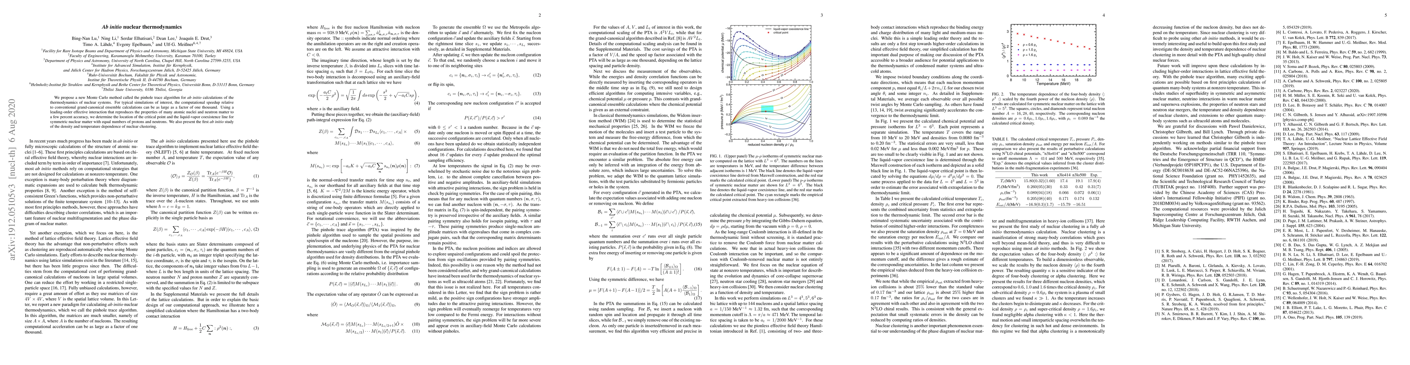 This paper introduces a novel Monte Carlo method, the pinhole trace algorithm, for {\it ab initio} nuclear thermodynamics calculations, achieving a significant speedup over conventional methods. It determines the critical point and liquid-vapor coexistence line for symmetric nuclear matter, and presents the first {\it ab initio} study of nuclear clustering's density and temperature dependence.