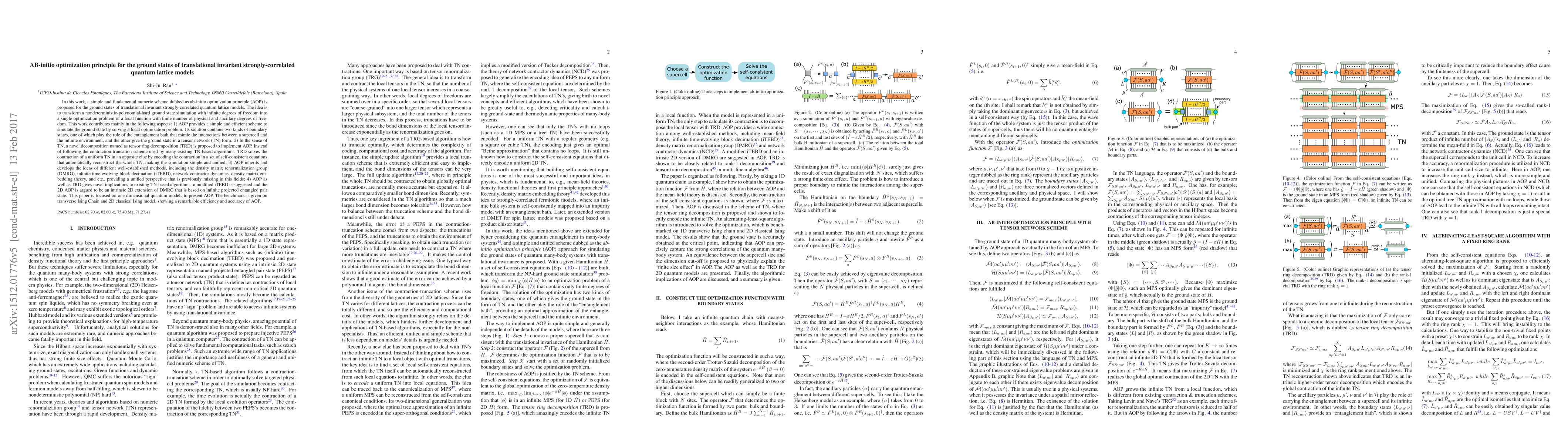 In this work, a simple and fundamental numeric scheme dubbed as ab-initio optimization principle (AOP) is proposed for the ground states of translational invariant strongly-correlated quantum lattice models. The idea is to transform a nondeterministic-polynomial-hard ground state simulation with infinite degrees of freedom into a single optimization problem of a local function with finite number of physical and ancillary degrees of freedom. This work contributes mainly in the following aspects: 1) AOP provides a simple and efficient scheme to simulate the ground state by solving a local optimization problem. Its solution contains two kinds of boundary states, one of which play the role of the entanglement bath that mimic the interactions between a supercell and the infinite environment, and the other give the ground state in a tensor network (TN) form. 2) In the sense of TN, a novel decomposition named as tensor ring decomposition (TRD) is proposed to implement AOP. Instead of following the contraction-truncation scheme used by many existing TN-based algorithms, TRD solves the contraction of a uniform TN in an opposite clue by encoding the contraction in a set of self-consistent equations that automatically reconstruct the whole TN, making the simulation simple and unified; 3) AOP inherits and develops the ideas of different well-established methods, including the density matrix renormalization group (DMRG), infinite time-evolving block decimation (iTEBD), network contractor dynamics, density matrix embedding theory, and etc., providing a unified perspective that is previously missing in this fields; 4) AOP as well as TRD gives novel implications to existing TN-based algorithms: a modified iTEBD is suggested and the 2D AOP is argued to be an intrinsic 2D extension of DMRG that is based on infinite projected entangled pair state.