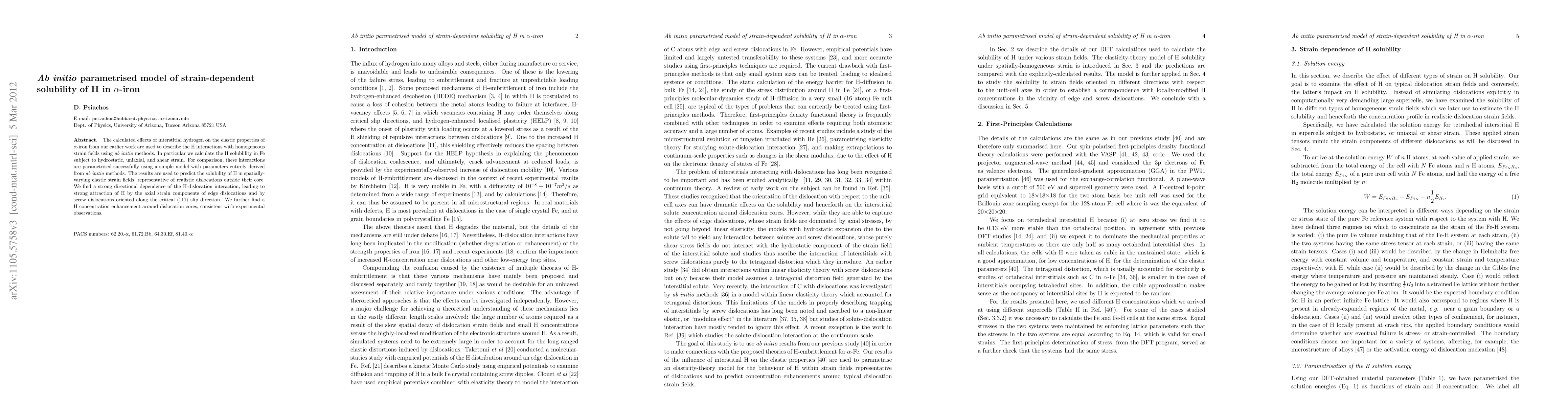 This paper uses ab initio methods to model the strain-dependent solubility of hydrogen in alpha-iron, finding that hydrogen solubility is strongly influenced by the direction of applied strain, particularly around dislocations, where it is significantly enhanced. The results are parametrized using a simple model derived from first-principles calculations.