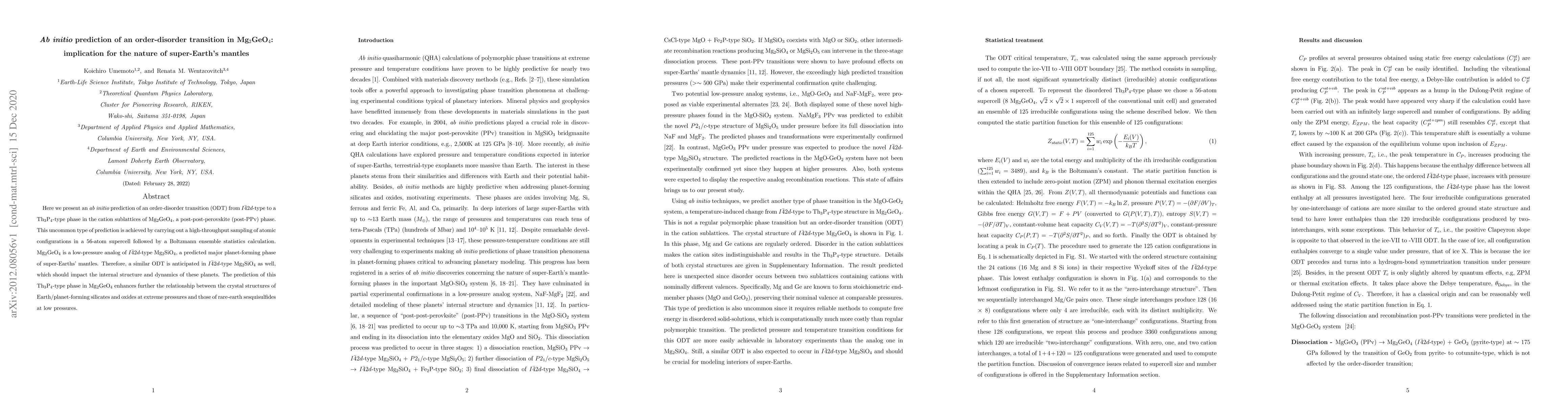 Researchers predict an order-disorder transition in Mg2GeO4, a silicate mineral found in super-Earths' mantles, using ab initio simulations. This finding has implications for understanding the internal structure of these planets.