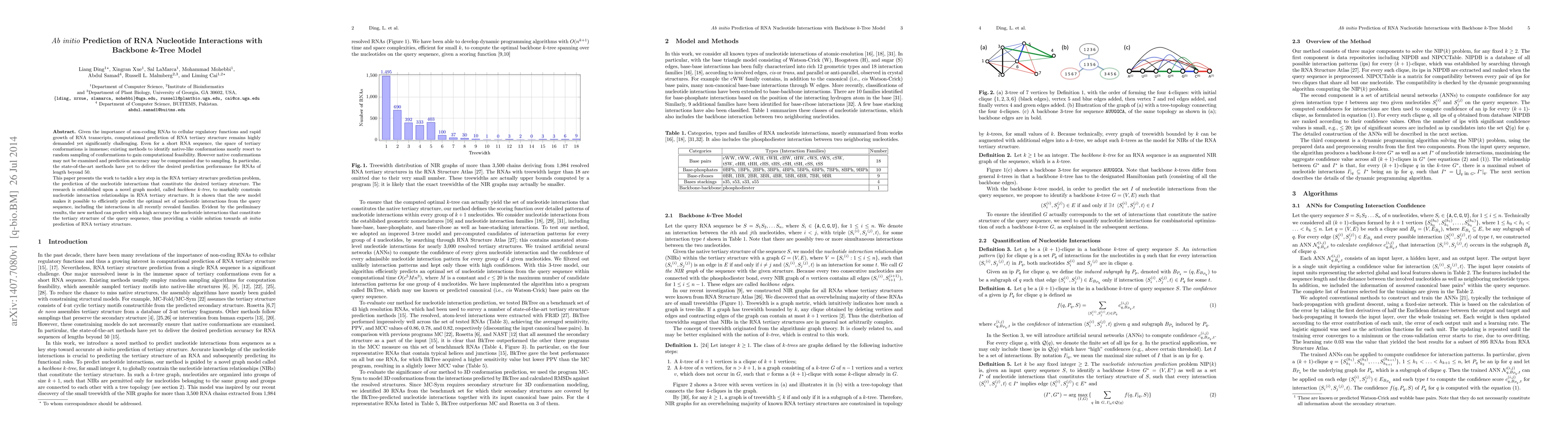 Given the importance of non-coding RNAs to cellular regulatory functions and rapid growth of RNA transcripts, computational prediction of RNA tertiary structure remains highly demanded yet significantly challenging. Even for a short RNA sequence, the space of tertiary conformations is immense; existing methods to identify native-like conformations mostly resort to random sampling of conformations to gain computational feasibility. However native conformations may not be examined and prediction accuracy may be compromised due to sampling. In particular, the state-of-the-art methods have yet to deliver the desired prediction performance for RNAs of length beyond 50. This paper presents the work to tackle a key step in the RNA tertiary structure prediction problem, the prediction of the nucleotide interactions that constitute the desired tertiary structure. The research is established upon a novel graph model, called backbone k-tree, to markably constrain nucleotide interaction relationships in RNA tertiary structure. It is shown that the new model makes it possible to efficiently predict the optimal set of nucleotide interactions from the query sequence, including the interactions in all recently revealed families. Evident by the preliminary results, the new method can predict with a high accuracy the nucleotide interactions that constitute the tertiary structure of the query sequence, thus providing a viable solution towards ab initio prediction of RNA tertiary structure.