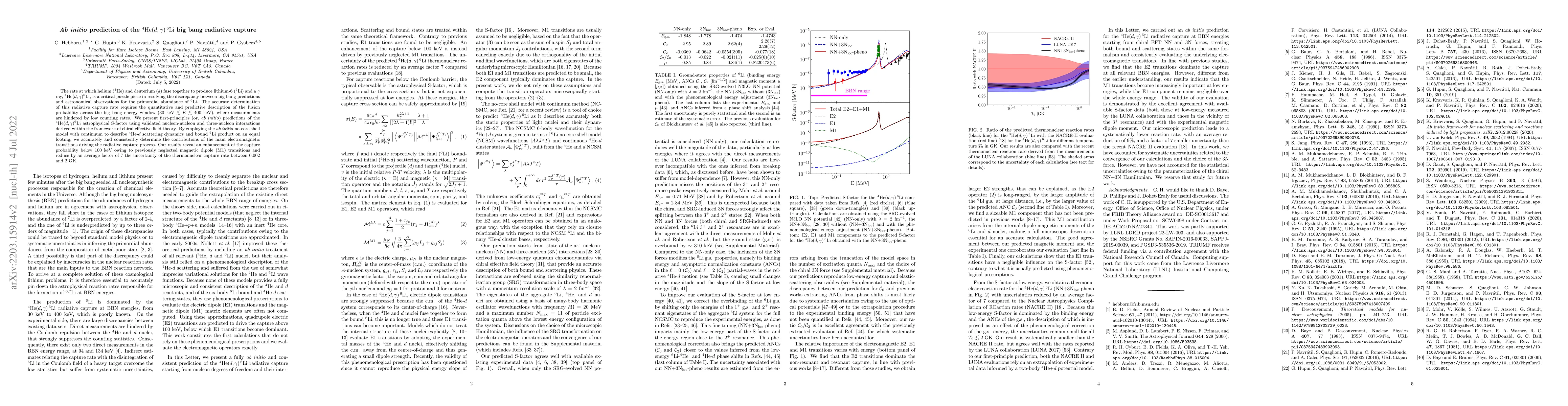 The rate at which helium ($^4$He) and deuterium ($d$) fuse together to produce lithium-6 ($^6$Li) and a $\gamma$ ray, $^4$He$(d,\gamma)^6$Li, is a critical puzzle piece in resolving the roughly three orders of magnitude discrepancy between big bang predictions and astronomical observations for the primordial abundance of $^6$Li. The accurate determination of this radiative capture rate requires the quantitative and predictive description of the fusion probability across the big bang energy window ($30$ keV $\lesssim E\lesssim 400$ keV), where measurements are hindered by low counting rates. We present first-principles (or, ab initio) predictions of the $^4$He$(d,\gamma)^6$Li astrophysical S-factor using validated nucleon-nucleon and three-nucleon interactions derived within the framework of chiral effective field theory. By employing the ab initio no-core shell model with continuum to describe $^4{\rm He}$-$d$ scattering dynamics and bound $^6\rm Li$ product on an equal footing, we accurately and consistently determine the contributions of the main electromagnetic transitions driving the radiative capture process. Our results reveal an enhancement of the capture probability below 100 keV owing to previously neglected magnetic dipole (M1) transitions and reduce by an average factor of 7 the uncertainty of the thermonuclear capture rate between $0.002$ and $2$ GK.
