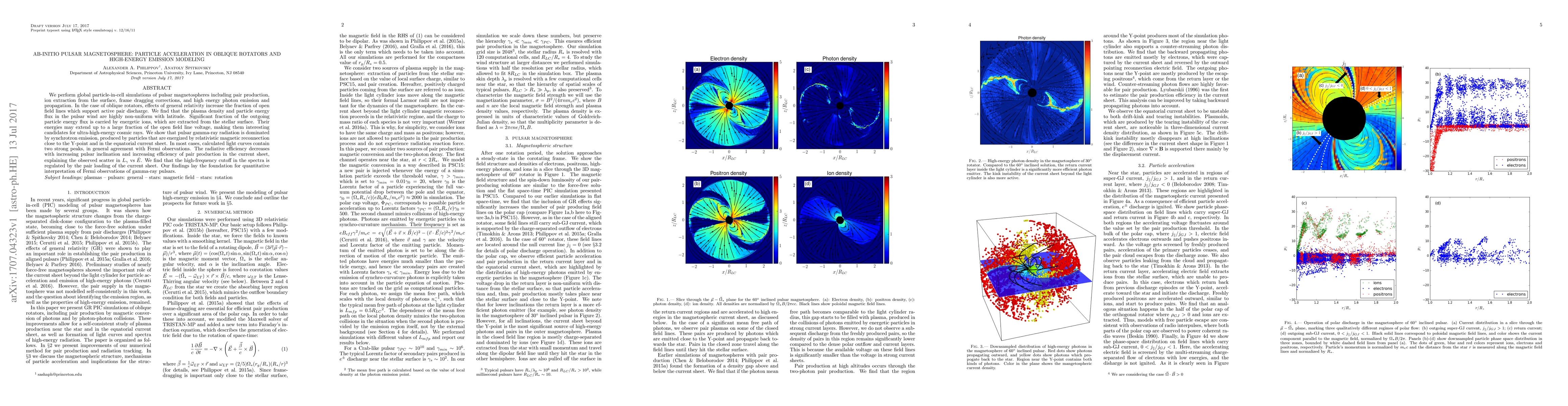This paper uses global particle-in-cell simulations to model pulsar magnetospheres, focusing on oblique rotators and high-energy emissions. The study reveals non-uniform particle energy flux and significant contributions from energetic ions, suggesting they could be ultra-high-energy cosmic rays, while gamma-ray radiation is primarily due to synchrotron emission from relativistic magnetic reconnection.