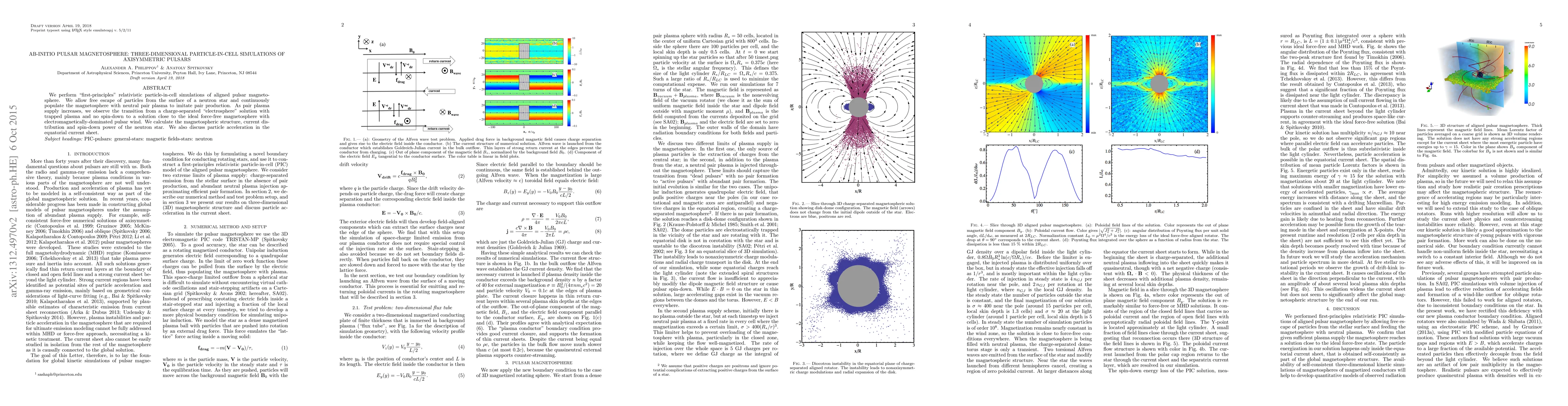 This paper presents ab-initio relativistic particle-in-cell simulations of pulsar magnetospheres, revealing the transition from electrosphere to force-free magnetosphere as pair plasma supply increases, and discusses the magnetospheric structure, current distribution, and particle acceleration.
