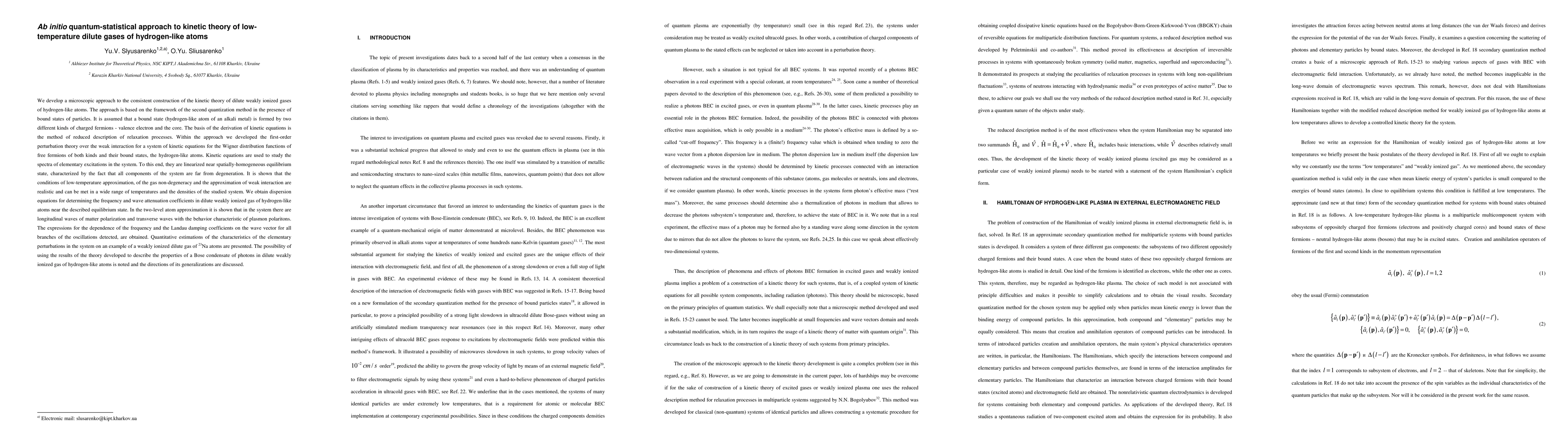 This paper develops a quantum-statistical approach to kinetic theory for low-temperature dilute gases of hydrogen-like atoms, employing second quantization and perturbation theory. It provides dispersion equations for frequency and wave attenuation, identifies longitudinal and plasmon polariton waves, and offers quantitative estimates for a weakly ionized Na-23 gas, with potential applications to photon Bose condensates.