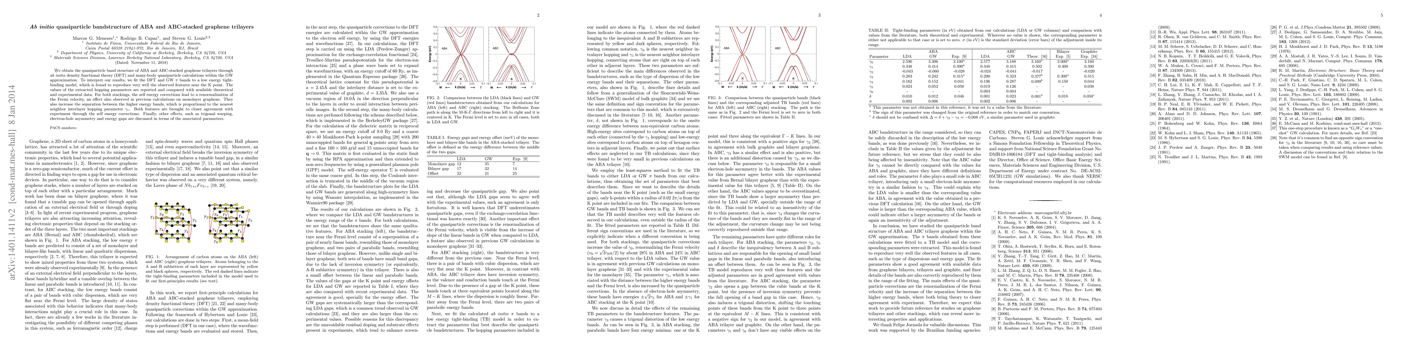 This study uses ab initio DFT and GW quasiparticle calculations to determine the quasiparticle band structure of ABA and ABC-stacked graphene trilayers, revealing renormalization of the Fermi velocity and increased band separation due to self-energy corrections, which align better with experimental data. The findings also discuss additional effects like trigonal warping and electron-hole asymmetry.