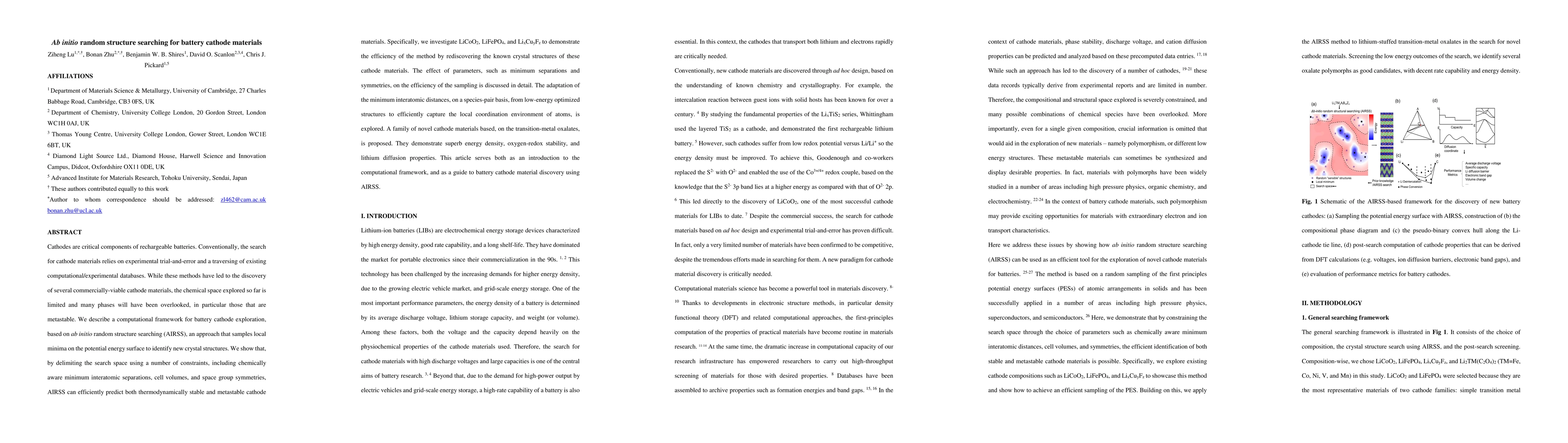 This paper introduces a computational framework called ab initio random structure searching (AIRSS) for discovering new battery cathode materials. By sampling local minima on the potential energy surface, AIRSS efficiently predicts both stable and metastable cathode materials, demonstrating its effectiveness through the rediscovery of known structures like LiCoO2 and LiFePO4.