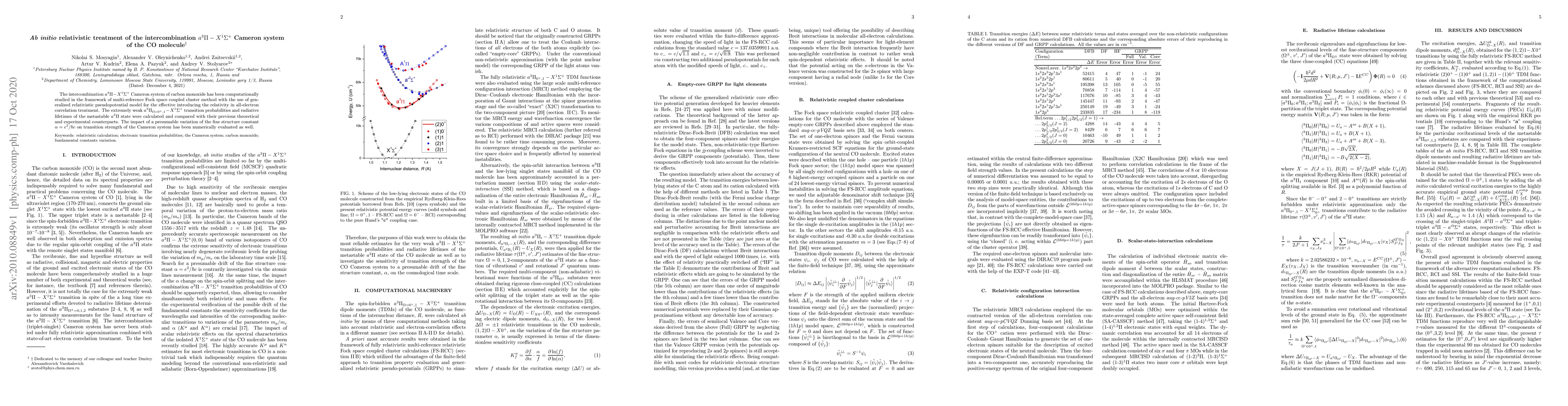 The intercombination $a^3\Pi - X^1\Sigma^+$ Cameron system of carbon monoxide has been computationally studied in the framework of multi-reference Fock space coupled cluster method with the use of generalized relativistic pseudopotential model for the effective introducing the relativity in all-electron correlation treatment. The extremely weak $a^3\Pi_{\Omega=0^+,1} - X^1\Sigma^+$ transition probabilities and radiative lifetimes of the metastable $a^3\Pi$ state were calculated and compared with their previous theoretical and experimental counterparts. The impact of a presumable variation of the fine structure constant $\alpha=e^2/\hbar c$ on transition strength of the Cameron system has been numerically evaluated as well.