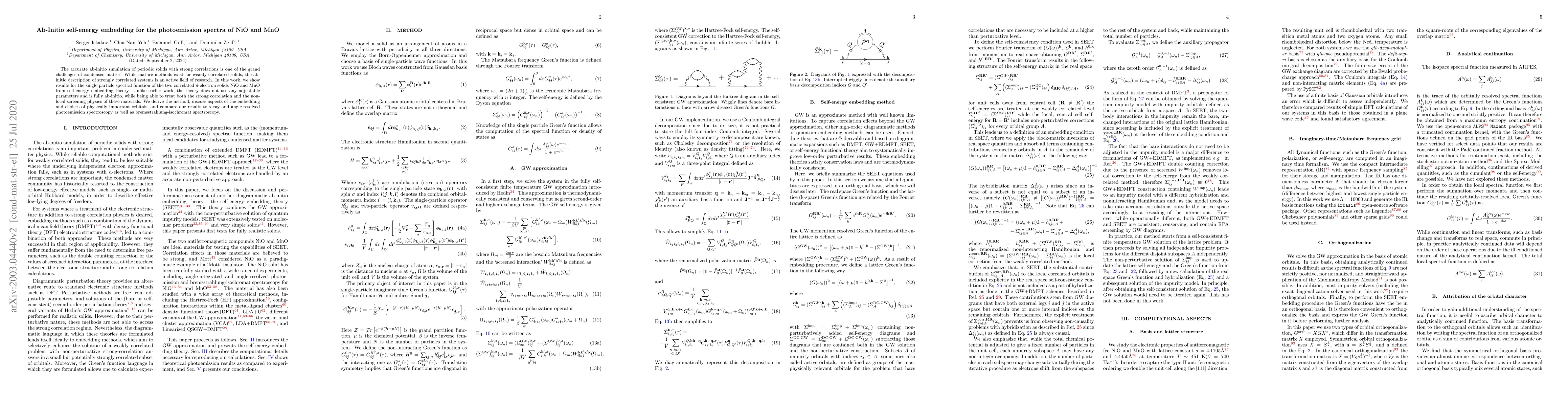 The accurate ab-initio simulation of periodic solids with strong correlations is one of the grand challenges of condensed matter. While mature methods exist for weakly correlated solids, the ab-initio description of strongly correlated systems is an active field of research. In this work, we show results for the single particle spectral function of the two correlated $d$-electron solids NiO and MnO from self-energy embedding theory. Unlike earlier work, the theory does not use any adjustable parameters and is fully ab-initio, while being able to treat both the strong correlation and the non-local screening physics of these materials. We derive the method, discuss aspects of the embedding and choices of physically important orbitals, and compare our results to x-ray and angle-resolved photoemission spectroscopy as well as bremsstrahlung-isochromat spectroscopy.