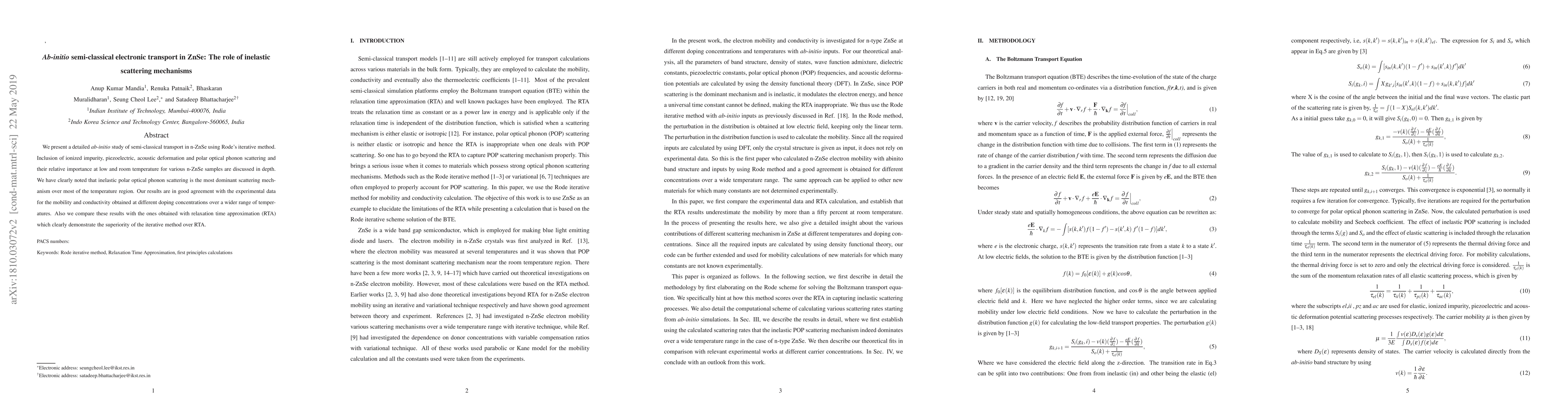 We present a detailed ab-initio study of semi-classical transport in n-ZnSe using Rode's iterative method. Inclusion of ionized impurity, piezoelectric, acoustic deformation and polar optical phonon scattering and their relative importance at low and room temperature for various n-ZnSe samples are discussed in depth. We have clearly noted that inelastic polar optical phonon scattering is the most dominant scattering mechanism over most of the temperature region. Our results are in good agreement with the experimental data for the mobility and conductivity obtained at different doping concentrations over a wider range of temperatures. Also we compare these results with the ones obtained with relaxation time approximation (RTA) which clearly demonstrate the superiority of the iterative method over RTA.