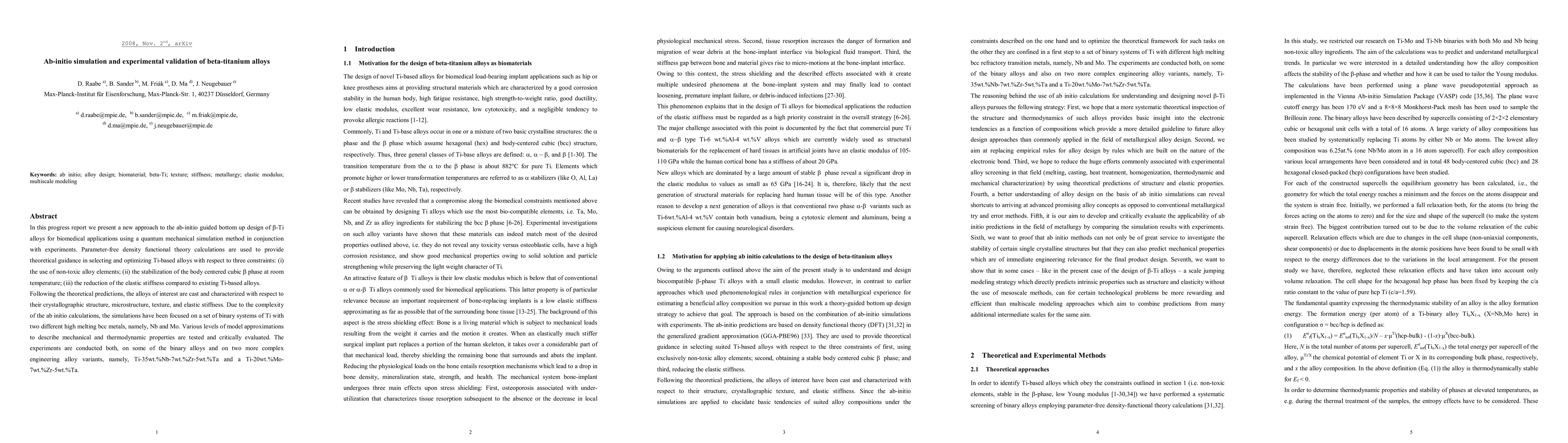 In this progress report we present a new approach to the ab-initio guided bottom up design of beta-Ti alloys for biomedical applications using a quantum mechanical simulation method in conjunction with experiments. Parameter-free density functional theory calculations are used to provide theoretical guidance in selecting and optimizing Ti-based alloys with respect to three constraints: (i) the use of non-toxic alloy elements; (ii) the stabilization of the body centered cubic beta phase at room temperature; (iii) the reduction of the elastic stiffness compared to existing Ti-based alloys. Following the theoretical predictions, the alloys of interest are cast and characterized with respect to their crystallographic structure, microstructure, texture, and elastic stiffness. Due to the complexity of the ab initio calculations, the simulations have been focused on a set of binary systems of Ti with two different high melting bcc metals, namely, Nb and Mo. Various levels of model approximations to describe mechanical and thermodynamic properties are tested and critically evaluated. The experiments are conducted both, on some of the binary alloys and on two more complex engineering alloy variants, namely, Ti-35wt.%Nb-7wt.%Zr-5wt.%Ta and a Ti-20wt.%Mo-7wt.%Zr-5wt.%Ta.