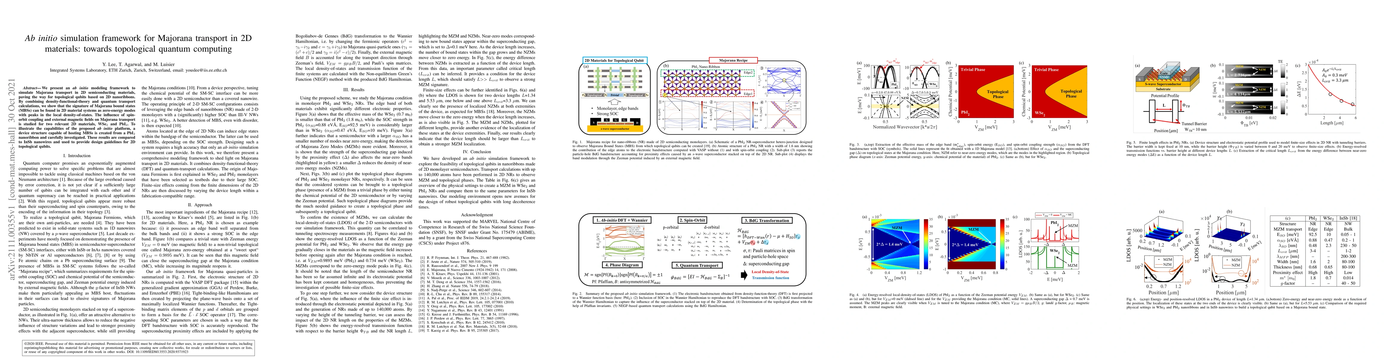 This paper introduces an ab initio simulation framework to study Majorana transport in 2D materials, demonstrating the presence of Majorana bound states as zero-energy modes. It analyzes the effects of spin-orbit coupling and magnetic fields on two materials, WSe2 and PbI2, and provides guidelines for designing topological qubits based on 2D nanoribbons.