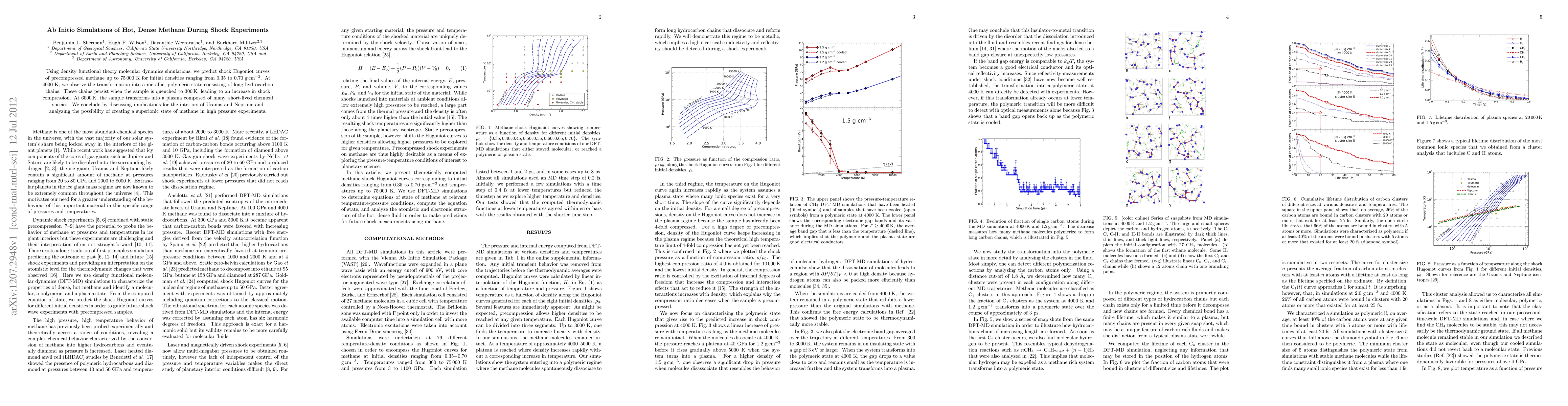 This study uses density functional theory to simulate shock Hugoniot curves for methane under extreme conditions, revealing a transition to a metallic, polymeric state at 4000 K and a plasma state at 6000 K, with implications for understanding the interiors of Uranus and Neptune.