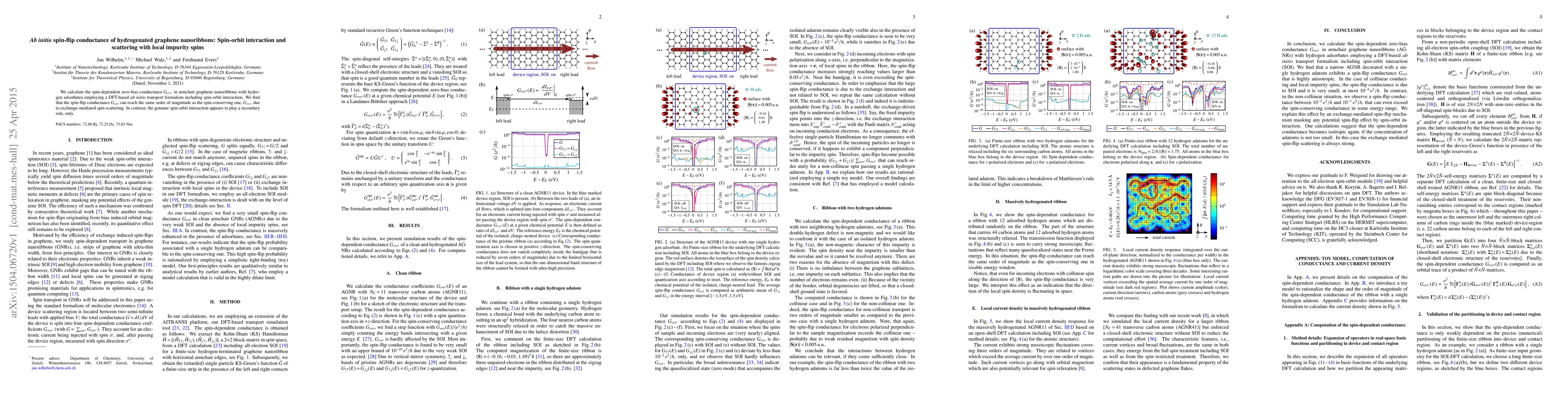 We calculate the spin-dependent zero-bias conductance $G_{\sigma\sigma'}$ in armchair graphene nanoribbons with hydrogen adsorbates employing a DFT-based ab initio transport formalism including spin-orbit interaction. We find that the spin-flip conductance $G_{\sigma\bar{\sigma}}$ can reach the same order of magnitude as the spin-conserving one, $G_{\sigma\sigma}$, due to exchange-mediated spin scattering. In contrast, the genuine spin-orbit interaction appears to play a secondary role, only.