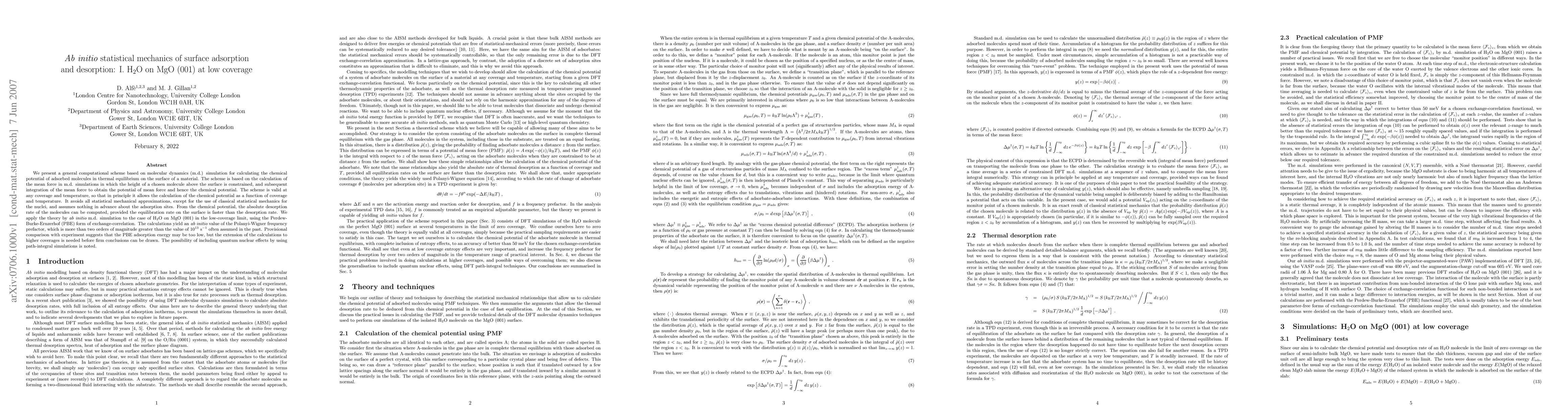 This paper introduces a computational scheme for calculating the chemical potential of adsorbed molecules using molecular dynamics simulations, which avoids statistical mechanical approximations. It applies this scheme to H$_2$O adsorption on MgO (001) at low coverage, finding an {\em ab initio} desorption rate prefactor significantly higher than previous assumptions, while noting the need for further calculations at higher coverages.