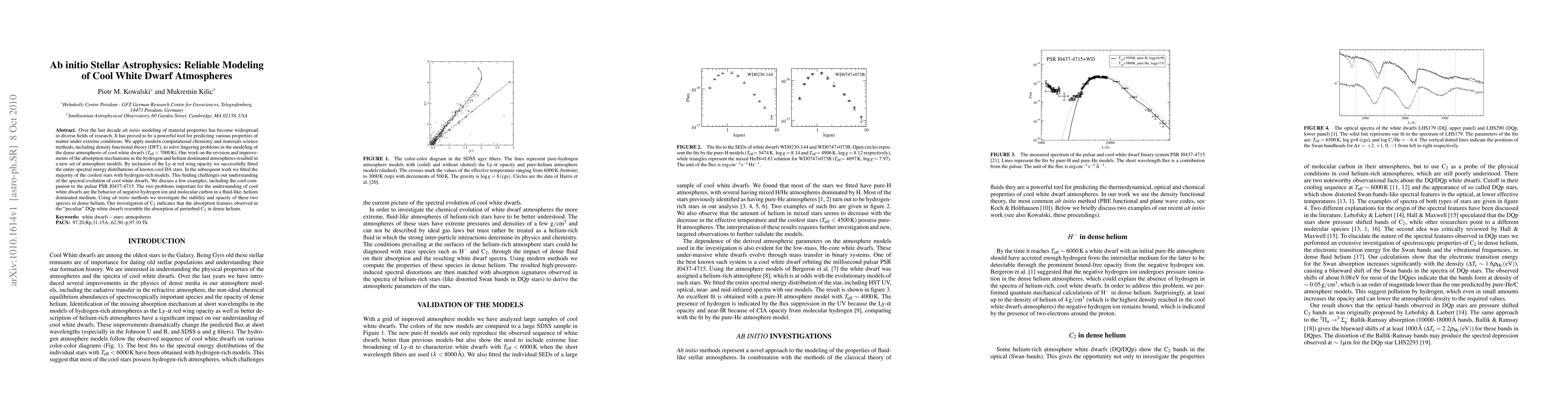 Over the last decade {\it ab initio} modeling of material properties has become widespread in diverse fields of research. It has proved to be a powerful tool for predicting various properties of matter under extreme conditions. We apply modern computational chemistry and materials science methods, including density functional theory (DFT), to solve lingering problems in the modeling of the dense atmospheres of cool white dwarfs ($T_{\rm eff}\rm <7000 \, K$). Our work on the revision and improvements of the absorption mechanisms in the hydrogen and helium dominated atmospheres resulted in a new set of atmosphere models. By inclusion of the Ly-$\rm \alpha$ red wing opacity we successfully fitted the entire spectral energy distributions of known cool DA stars. In the subsequent work we fitted the majority of the coolest stars with hydrogen-rich models. This finding challenges our understanding of the spectral evolution of cool white dwarfs. We discuss a few examples, including the cool companion to the pulsar PSR J0437-4715. The two problems important for the understanding of cool white dwarfs are the behavior of negative hydrogen ion and molecular carbon in a fluid-like, helium dominated medium. Using {\it ab initio} methods we investigate the stability and opacity of these two species in dense helium. Our investigation of $\rm C_2$ indicates that the absorption features observed in the ``peculiar'' DQp white dwarfs resemble the absorption of perturbed $\rm C_2$ in dense helium.