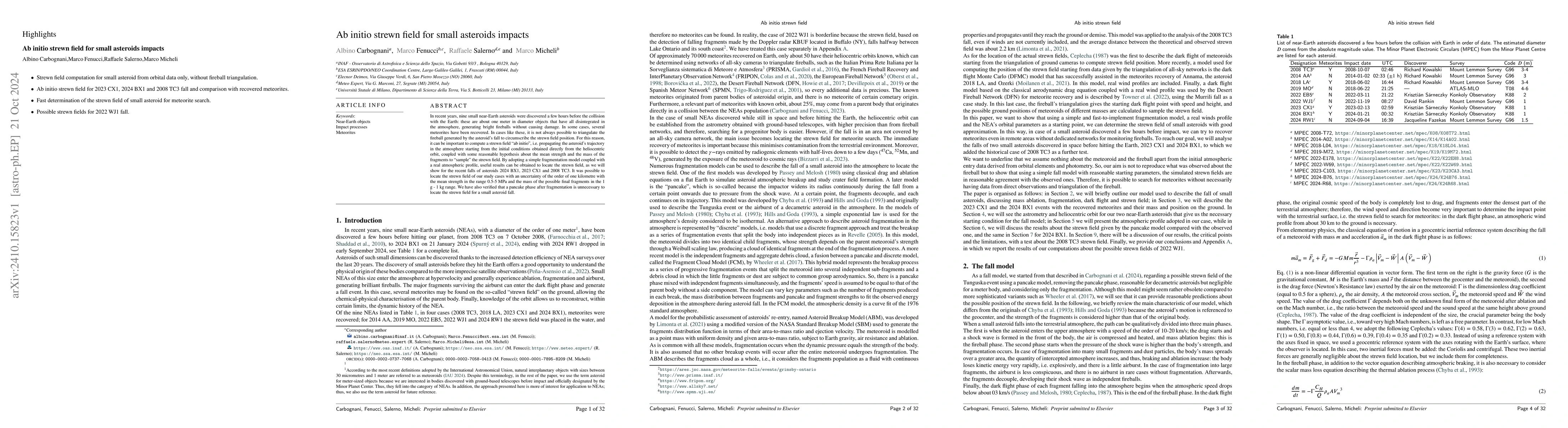 This paper develops an "ab initio" strewn field computation method for small near-Earth asteroids, focusing on recent falls like 2024 BX1, 2023 CX1, and 2008 TC3. The study propagates asteroid trajectories in the atmosphere from initial conditions, predicting strewn fields using a simple fragmentation model and atmospheric profiles, achieving an uncertainty of about one kilometer.