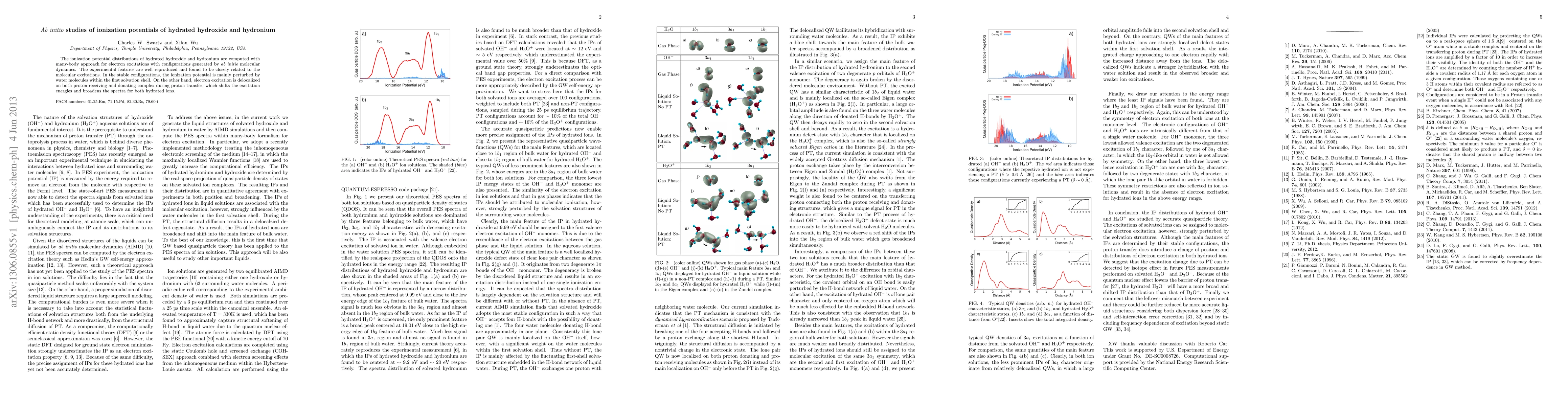 This study uses an ab initio many-body approach to compute ionization potential distributions for hydrated hydroxide and hydronium, revealing that water molecules in the first solvation shell significantly affect ionization potentials. The delocalization of electron excitations during proton transfer shifts excitation energies and broadens the spectra, closely mirroring experimental observations.