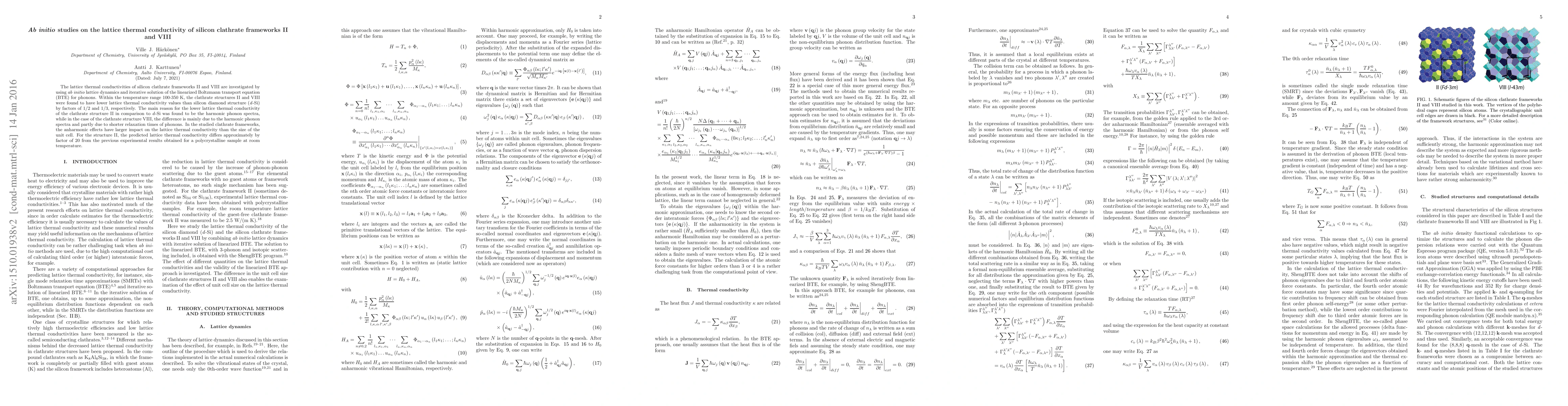 The lattice thermal conductivities of silicon clathrate frameworks II and VIII are investigated by using ab initio lattice dynamics and iterative solution of the linearized Boltzmann transport equation(BTE) for phonons. Within the temperature range 100-350 K, the clathrate structures II and VIII were found to have lower lattice thermal conductivity values than silicon diamond structure (d-Si) by factors of 1/2 and 1/5, respectively. The main reason for the lower lattice thermal conductivity of the clathrate structure II in comparison to d-Si was found to be the harmonic phonon spectra, while in the case of the clathrate structure VIII, the difference is mainly due to the harmonic phonon spectra and partly due to shorter relaxation times of phonons. In the studied clathrate frameworks, the anharmonic effects have larger impact on the lattice thermal conductivity than the size of the unit cell. For the structure II, the predicted lattice thermal conductivity differs approximately by factor of 20 from the previous experimental results obtained for a polycrystalline sample at room temperature.