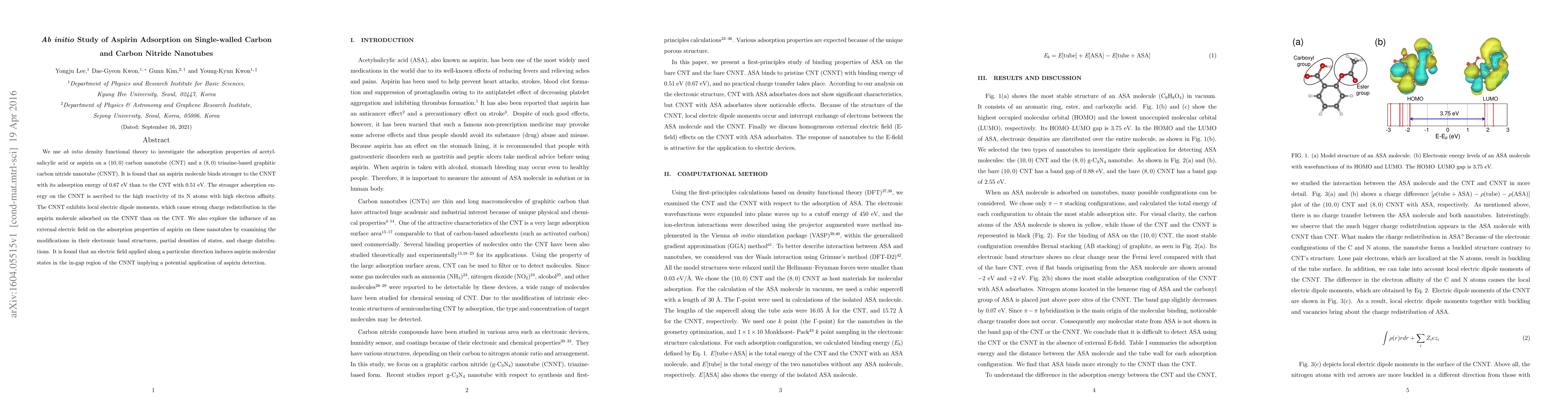 This study uses ab initio density functional theory to compare aspirin adsorption on carbon nanotubes and carbon nitride nanotubes, finding that aspirin binds stronger to the latter due to higher nitrogen reactivity and local electric dipole moments, with potential applications in aspirin detection under an electric field.