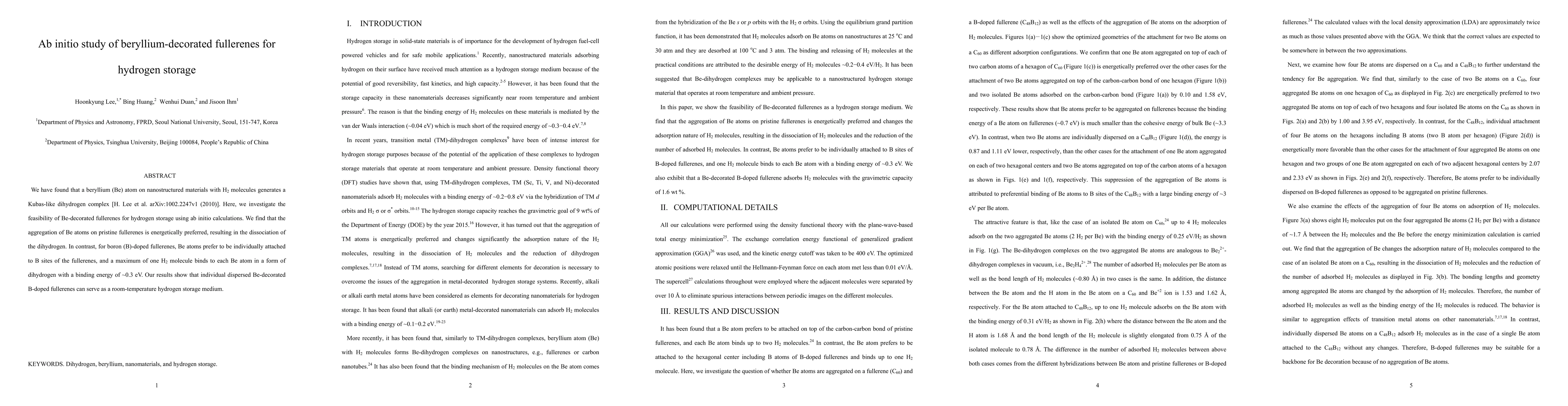 This study utilizes ab initio calculations to explore the hydrogen storage potential of beryllium-decorated fullerenes. The findings reveal that aggregated beryllium atoms on pristine fullerenes promote hydrogen dissociation, whereas individual beryllium atoms on boron-doped fullerenes bind up to one H2 molecule each, indicating that such Be-decorated B-doped fullerenes can effectively store hydrogen at room temperature.