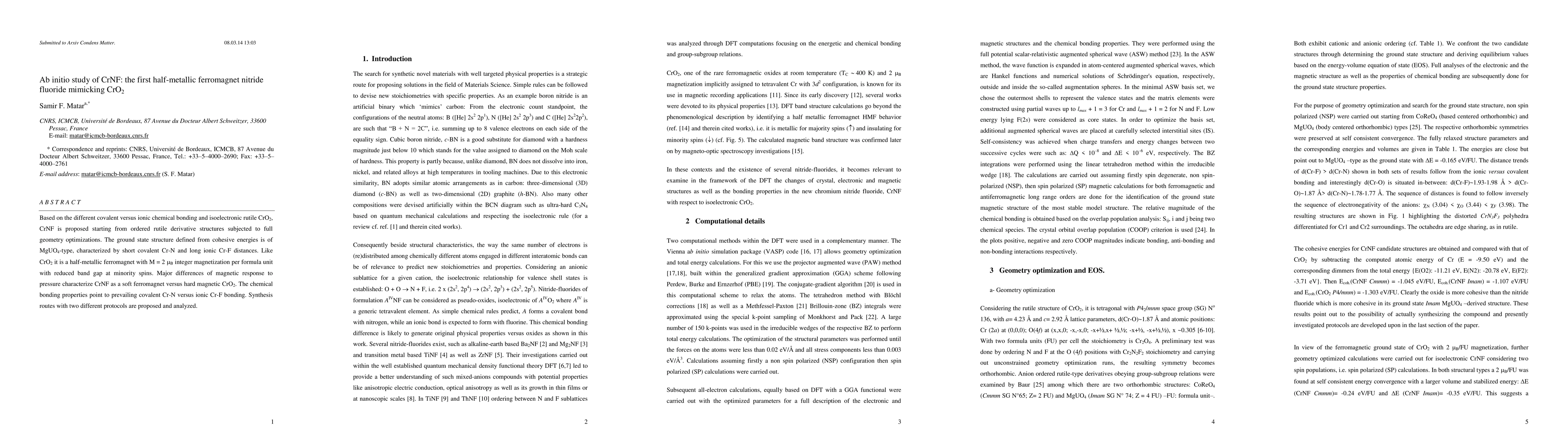 Based on the different covalent versus ionic chemical bonding and isoelectronic rutile CrO2, CrNF is proposed starting from ordered rutile derivative structures subjected to full geometry optimizations. The ground state structure defined from cohesive energies is of MgUO4-type, characterized by short covalent Cr-N and long ionic Cr-F distances. Like CrO2 it is a half-metallic ferromagnet with M = 2 Bohr Magnetons integer magnetization per formula unit with reduced band gap at minority spins. Major differences of magnetic response to pressure characterize CrNF as a soft ferromagnet versus hard magnetic CrO2. The chemical bonding properties point to prevailing covalent Cr-N versus ionic Cr-F bonding. Synthesis routes with two different protocols are proposed and analyzed.
