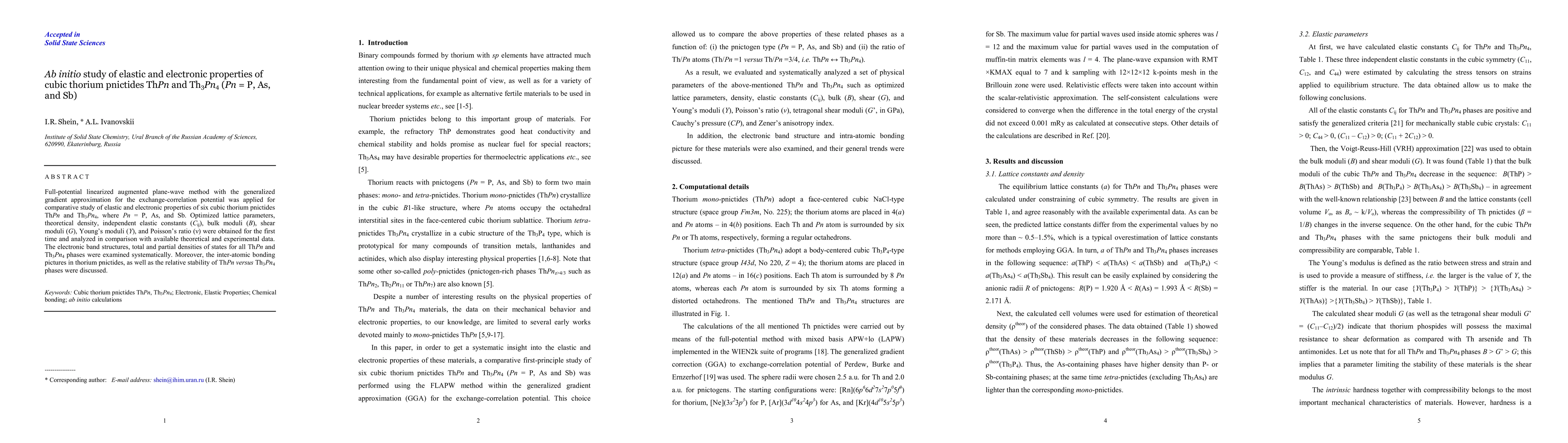 This study uses ab initio methods to investigate the elastic and electronic properties of cubic thorium pnictides ThPn and Th3Pn4 (Pn = P, As, Sb). It reports optimized lattice parameters, elastic constants, and electronic band structures, providing insights into the bonding and stability of these materials.