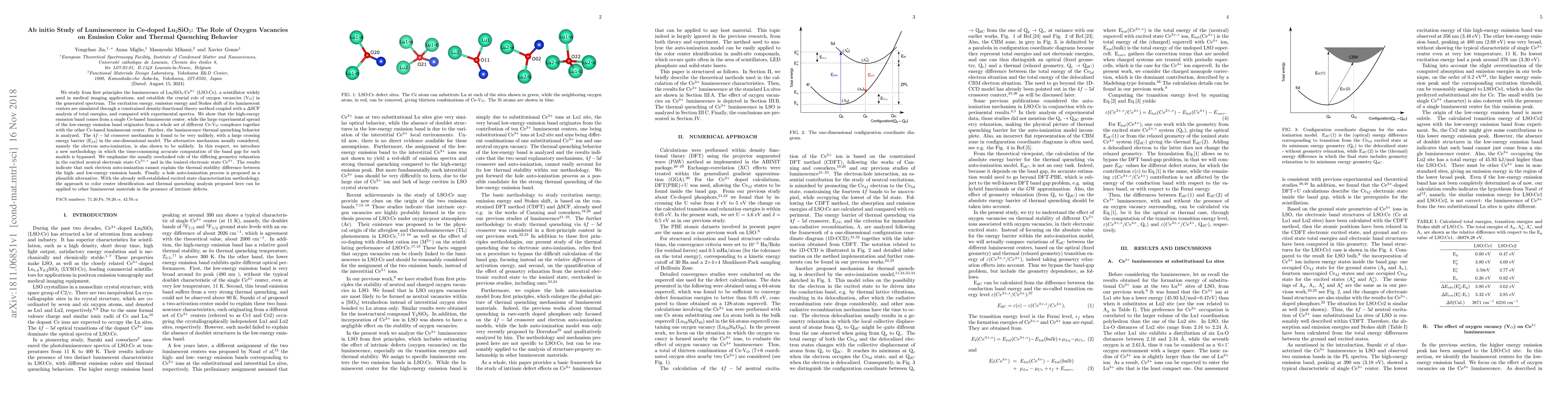 We study from first principles the luminescence of Lu$_2$SiO$_5$:Ce$^{3+}$ (LSO:Ce), a scintillator widely used in medical imaging applications, and establish the crucial role of oxygen vacancies (V$_O$) in the generated spectrum. The excitation energy, emission energy and Stokes shift of its luminescent centers are simulated through a constrained density-functional theory method coupled with a ${\Delta}$SCF analysis of total energies, and compared with experimental spectra. We show that the high-energy emission band comes from a single Ce-based luminescent center, while the large experimental spread of the low-energy emission band originates from a whole set of different Ce-V$_O$ complexes together with the other Ce-based luminescent center. Further, the luminescence thermal quenching behavior is analyzed. The $4f-5d$ crossover mechanism is found to be very unlikely, with a large crossing energy barrier (E$_{fd}$) in the one-dimensional model. The alternative mechanism usually considered, namely the electron auto-ionization, is also shown to be unlikely. In this respect, we introduce a new methodology in which the time-consuming accurate computation of the band gap for such models is bypassed. We emphasize the usually overlooked role of the differing geometry relaxation in the excited neutral electronic state Ce$^{3+,*}$ and in the ionized electronic state Ce$^{4+}$. The results indicate that such electron auto-ionization cannot explain the thermal stability difference between the high- and low-energy emission bands. Finally, a hole auto-ionization process is proposed as a plausible alternative. With the already well-established excited state characterization methodology, the approach to color center identification and thermal quenching analysis proposed here can be applied to other luminescent materials in the presence of intrinsic defects.