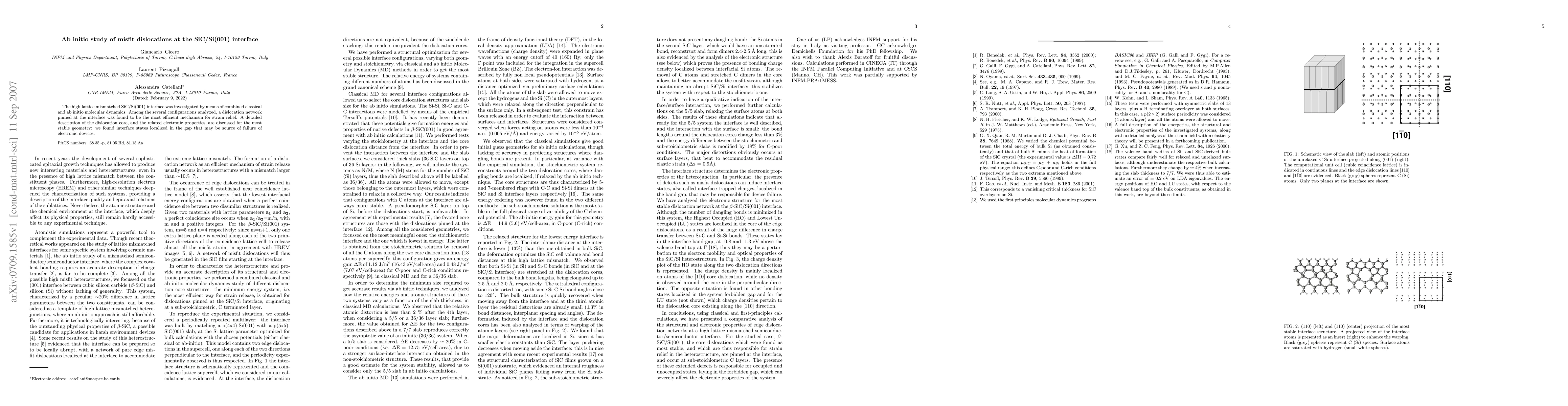 The high lattice mismatched SiC/Si(001) interface was investigated by means of combined classical and ab initio molecular dynamics. Among the several configurations analyzed, a dislocation network pinned at the interface was found to be the most efficient mechanism for strain relief. A detailed description of the dislocation core is given, and the related electronic properties are discussed for the most stable geometry: we found interface states localized in the gap that may be a source of failure of electronic devices.