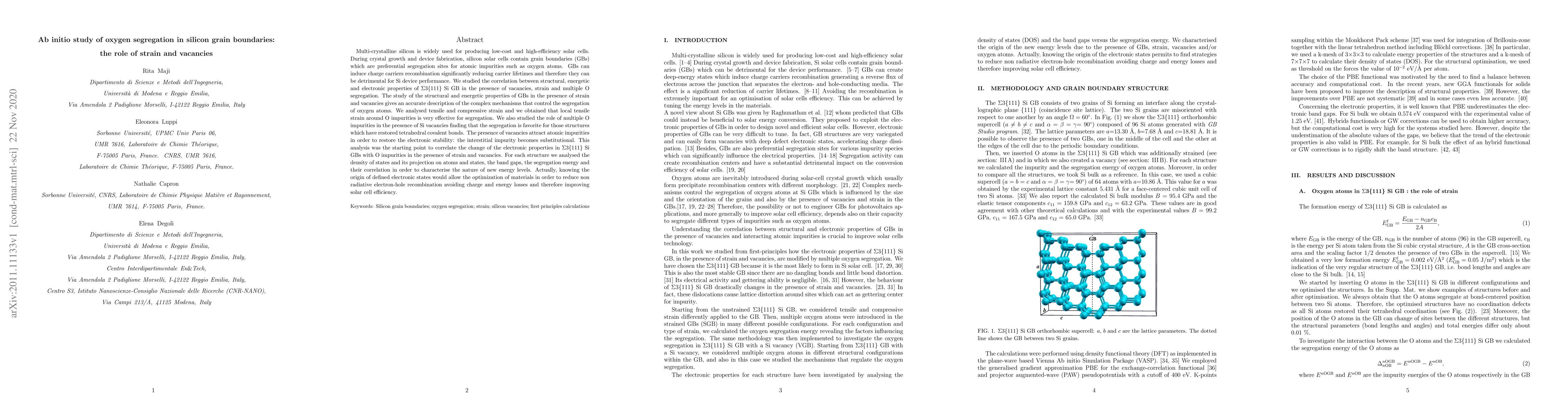 This paper investigates the segregation of oxygen atoms in silicon grain boundaries (GBs) under strain and vacancies, revealing that tensile strain enhances oxygen segregation. The study finds that oxygen atoms favor structures with restored tetrahedral bonds, and vacancies attract impurities to restore electronic stability, leading to optimized material properties that reduce recombination losses and improve solar cell efficiency.
