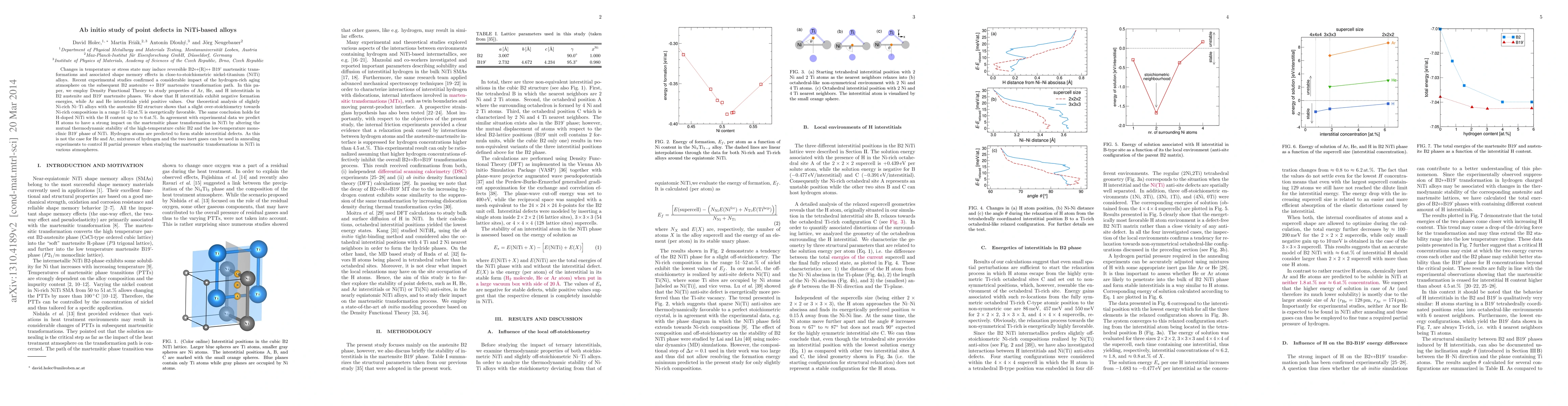 Changes in temperature or stress state may induce reversible B2$\leftrightarrow$(R)$\leftrightarrow$ B19' martensitic transformations and associated shape memory effects in close-to-stoichiometric nickel-titanium (NiTi) alloys. Recent experimental studies confirmed a considerable impact of the hydrogen-rich aging atmosphere on the subsequent B2 austenite $\leftrightarrow$ B19' martensite transformation path. In this paper, we employ Density Functional Theory to study properties of Ar, He, and H interstitials in B2 austenite and B19' martensite phases. We show that H interstitials exhibit negative formation energies, while Ar and He interstitials yield positive values. Our theoretical analysis of slightly Ni-rich Ni--Ti alloys with the austenite B2 structure shows that a slight over-stoichiometry towards Ni-rich compositions in a range 51--$52\,\text{at.%}$ is energetically favorable. The same conclusion holds for H-doped NiTi with the H content up to $\approx6\,\text{at.%}$. In agreement with experimental data we predict H atoms to have a strong impact on the martensitic phase transformation in NiTi by altering the mutual thermodynamic stability of the high-temperature cubic B2 and the low-temperature monoclinic B19' phase of NiTi. Hydrogen atoms are predicted to form stable interstitial defects. As this is not the case for He and Ar, mixtures of hydrogen and the two inert gases can be used in annealing experiments to control H partial pressure when studying the martensitic transformations in NiTi in various atmospheres.