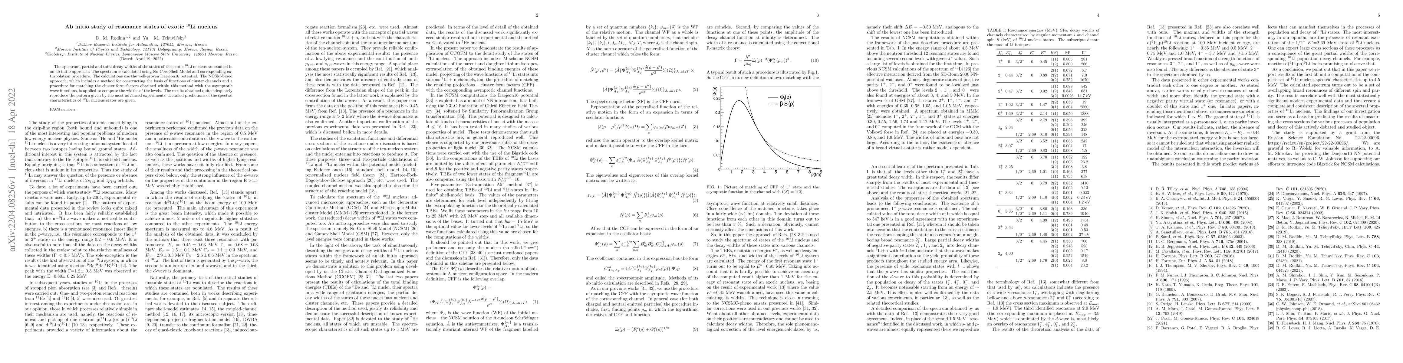 The spectrum, partial and total decay widths of the states of the exotic 10Li nucleus are studied in an ab initio approach. The spectrum is calculated using No-Core Shell Model and corresponding extrapolation procedure. The calculations use the well-proven Daejeon16 potential. The NCSM-based approach, which includes a method for constructing the basis of functions of cluster channels and a procedure for matching the cluster form factors obtained within this method with the asymptotic wave functions, is applied to compute the widths of the levels. The results obtained quite adequately reproduce the pattern given by the most advanced experiments. Detailed predictions of the spectral characteristics of 10Li nucleus states are given.