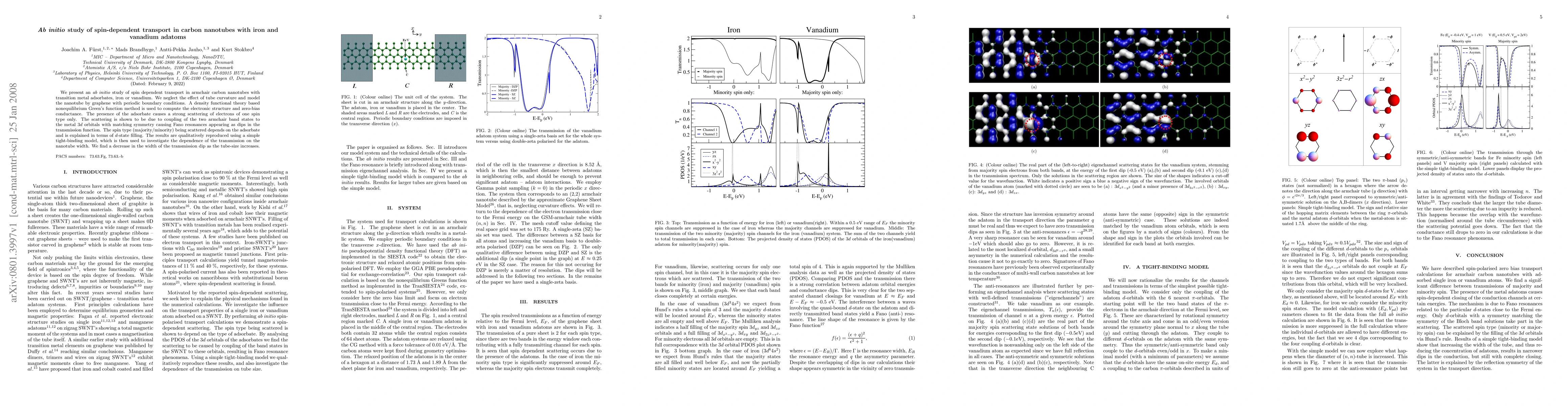 We present an ab initio study of spin dependent transport in armchair carbon nanotubes with transition metal adsorbates, iron or vanadium. We neglect the effect of tube curvature and model the nanotube by graphene with periodic boundary conditions. A density functional theory based nonequilibrium Green's function method is used to compute the electronic structure and zero-bias conductance. The presence of the adsorbate causes a strong scattering of electrons of one spin type only. The scattering is shown to be due to coupling of the two armchair band states to the metal 3d orbitals with matching symmetry causing Fano resonances appearing as dips in the transmission function. The spin type (majority/minority) being scattered depends on the adsorbate and is explained in terms of d-state filling. The results are qualitatively reproduced using a simple tight-binding model, which is then used to investigate the dependence of the transmission on the nanotube width. We find a decrease in the width of the transmission dip as the tube-size increases.