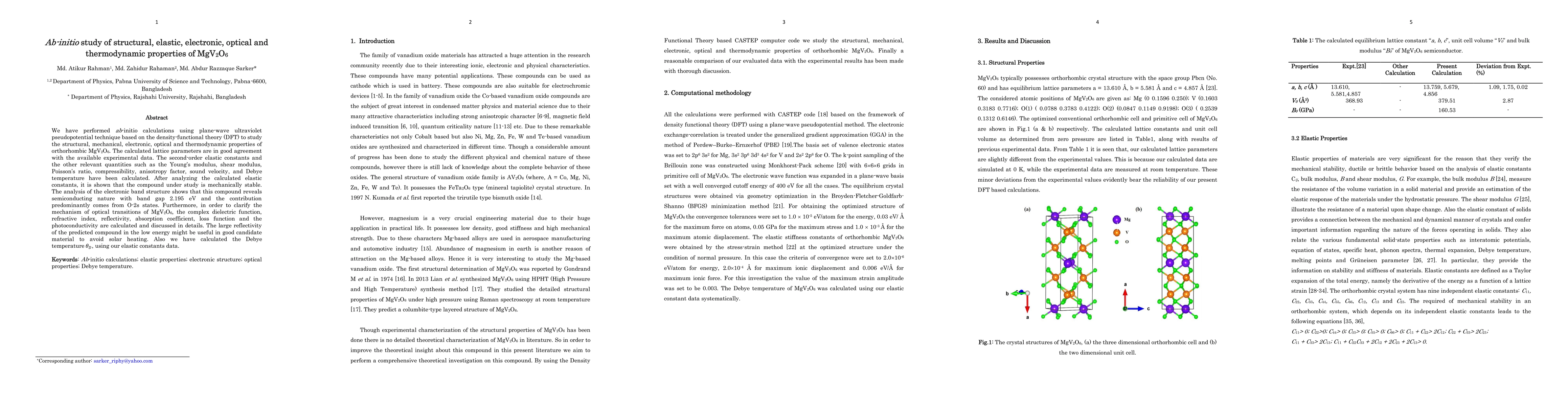 This paper uses ab-initio DFT calculations to investigate MgV2O6, finding good agreement with experimental lattice parameters. The compound is mechanically stable, with calculated elastic constants, and exhibits semiconducting behavior with a band gap of 2.195 eV, mainly from O-2s states.