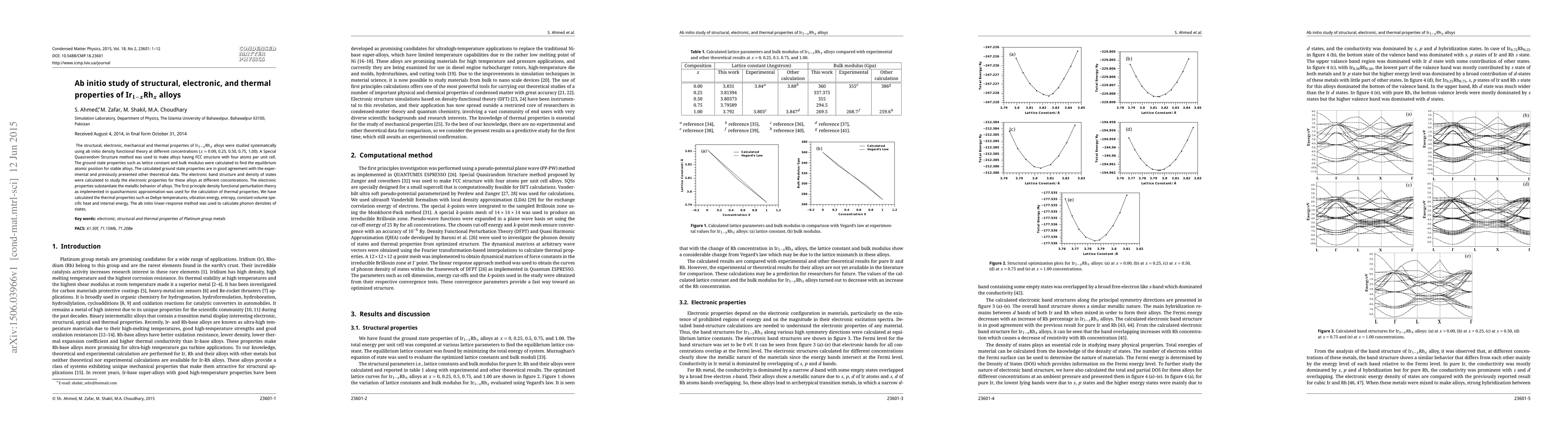 This study uses ab initio density functional theory to investigate the structural, electronic, mechanical, and thermal properties of Ir$_{1-x}$Rh$_{x}$ alloys at various concentrations. The research confirms metallic behavior through electronic band structure analysis and calculates thermal properties using density functional perturbation theory.