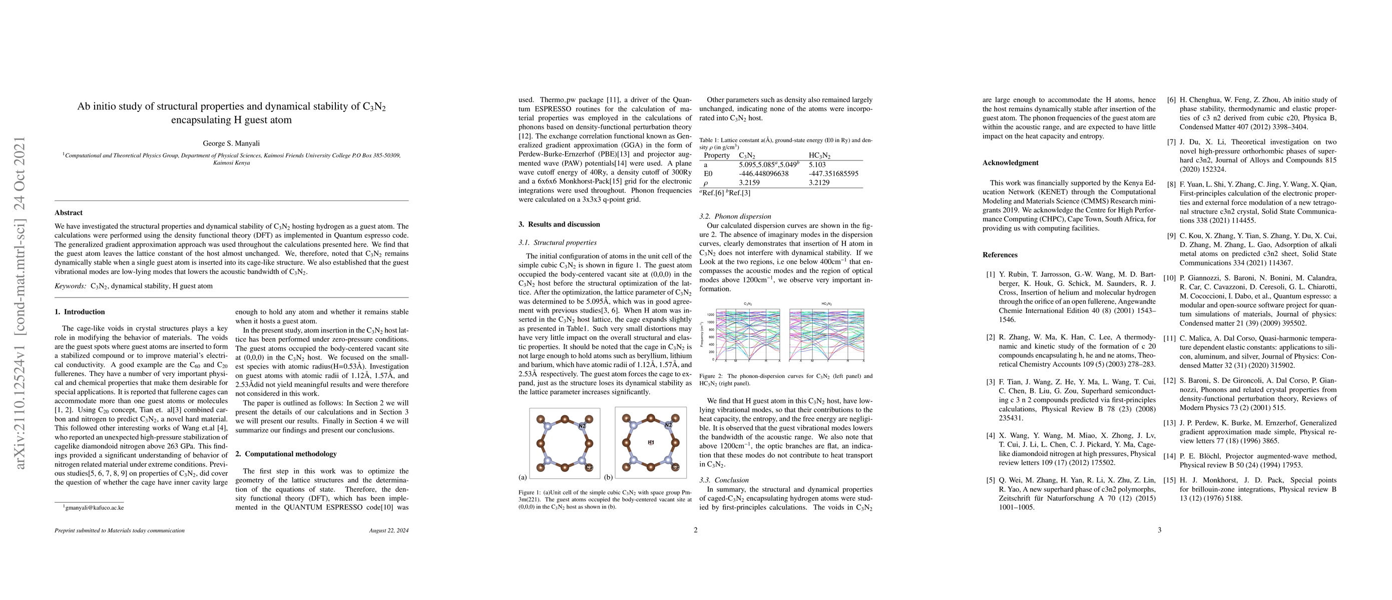 This study uses density functional theory to examine the structural and dynamical stability of C$_3$N$_2$ encapsulating a hydrogen atom. Results show minimal change in the lattice constant and confirm the dynamical stability of C$_3$N$_2$ with the guest atom, while noting low-lying vibrational modes that reduce the acoustic bandwidth.