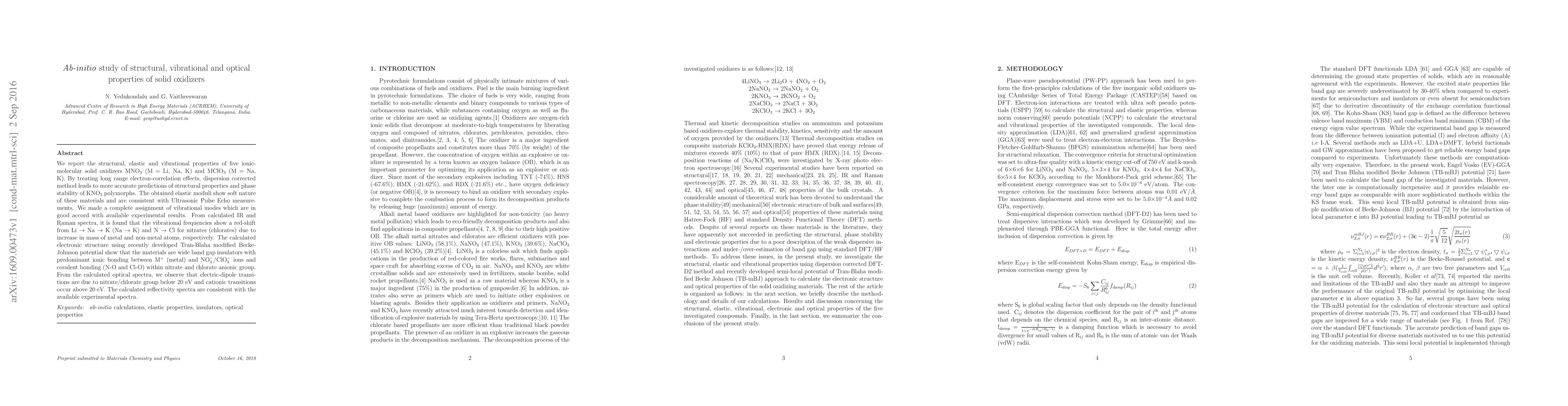 This study uses ab-initio methods to analyze the structural, elastic, and optical properties of solid oxidizers MNO$_3$ (M = Li, Na, K) and MClO$_3$ (M = Na, K), revealing their ionic bonding and wide band gap insulating nature. The vibrational frequencies show a red-shift trend correlating with the atomic masses, and calculated optical spectra match experimental data.