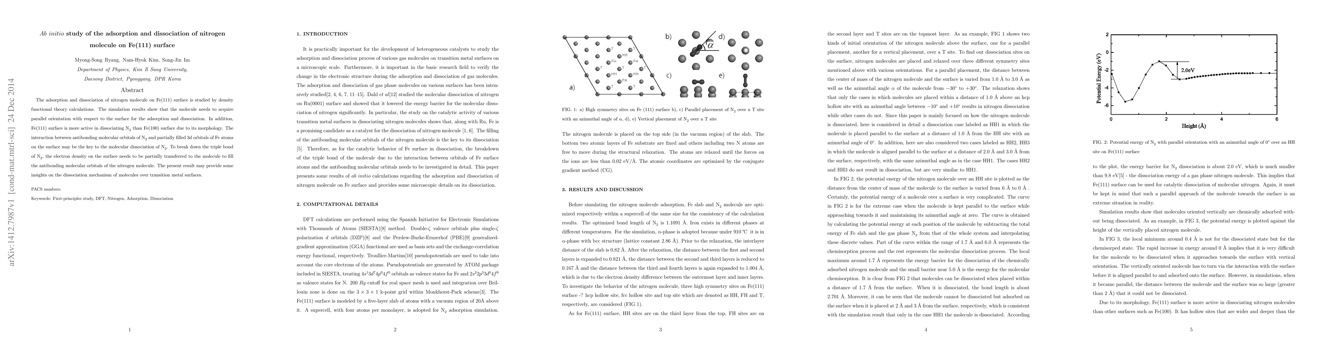 This study uses density functional theory to investigate the adsorption and dissociation of nitrogen molecule on Fe(111) surface, revealing that parallel orientation and electron density transfer from the surface to N2's antibonding orbitals are crucial for the dissociation process. Fe(111) surface is more active than Fe(100) due to its unique morphology, providing insights into molecular dissociation mechanisms on transition metal surfaces.