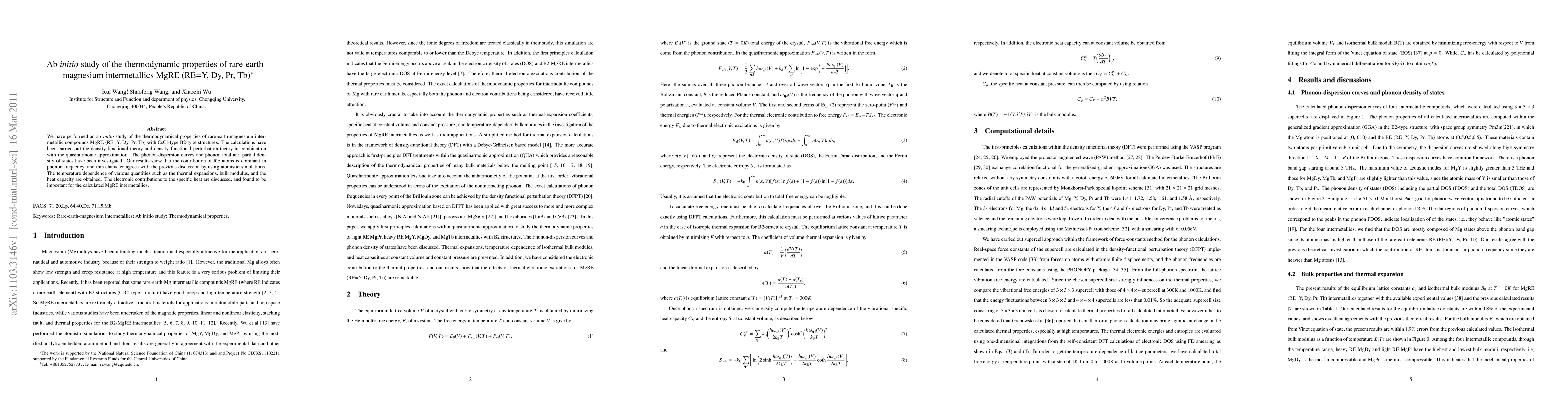 This paper uses ab initio density functional theory to study the thermodynamic properties of MgRE (RE=Y, Dy, Pr, Tb) intermetallics, finding that rare-earth atoms significantly influence phonon frequencies. The research also investigates temperature-dependent properties like thermal expansion, bulk modulus, and heat capacity, highlighting the electronic contributions to specific heat.