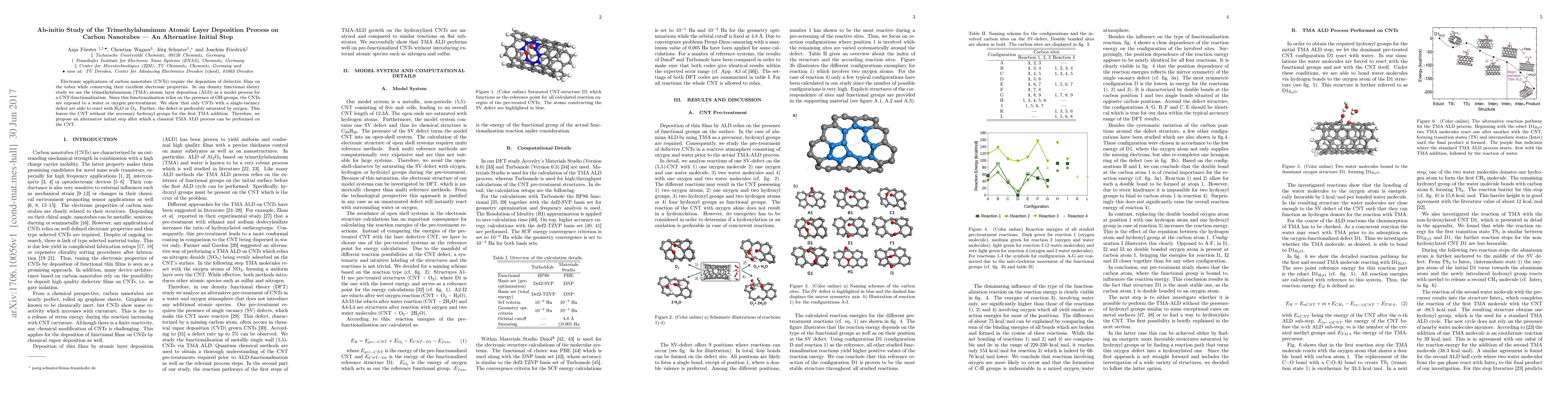 Electronic applications of carbon nanotubes (CNTs) require the deposition of dielectric films on the tubes while conserving their excellent electronic properties. In our density functional theory study we use the trimethylaluminum (TMA) atomic layer deposition (ALD) as a model process for a CNT-functionalization. Since this functionalization relies on the presence of OH-groups, the CNTs are exposed to a water or oxygen pre-treatment. We show that only CNTs with a single-vacancy defect are able to react with H$_{2}$O or O$_{2}$. Further, the defect is preferably saturated by oxygen. This leaves the CNT without the necessary hydroxyl groups for the first TMA addition. Therefore, we propose an alternative initial step after which a classical TMA ALD process can be performed on the CNT.