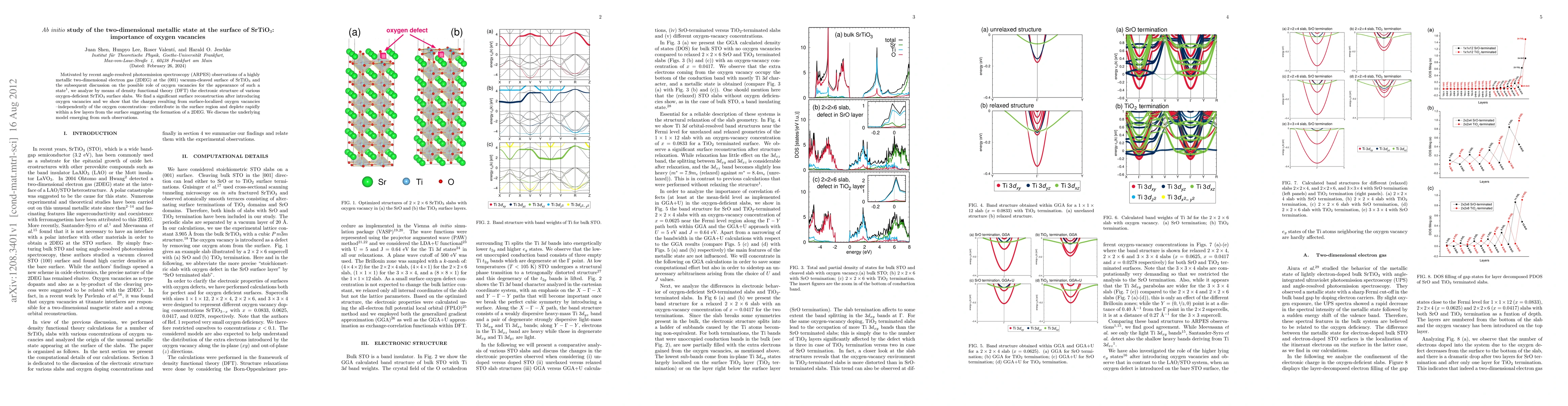 This study uses density functional theory to investigate the electronic structure of oxygen-deficient SrTiO3 surfaces, revealing significant surface reconstruction and charge redistribution due to oxygen vacancies, which suggests the formation of a two-dimensional electron gas (2DEG) at the surface. The findings underscore the importance of oxygen vacancies in achieving metallic states on SrTiO3 surfaces.
