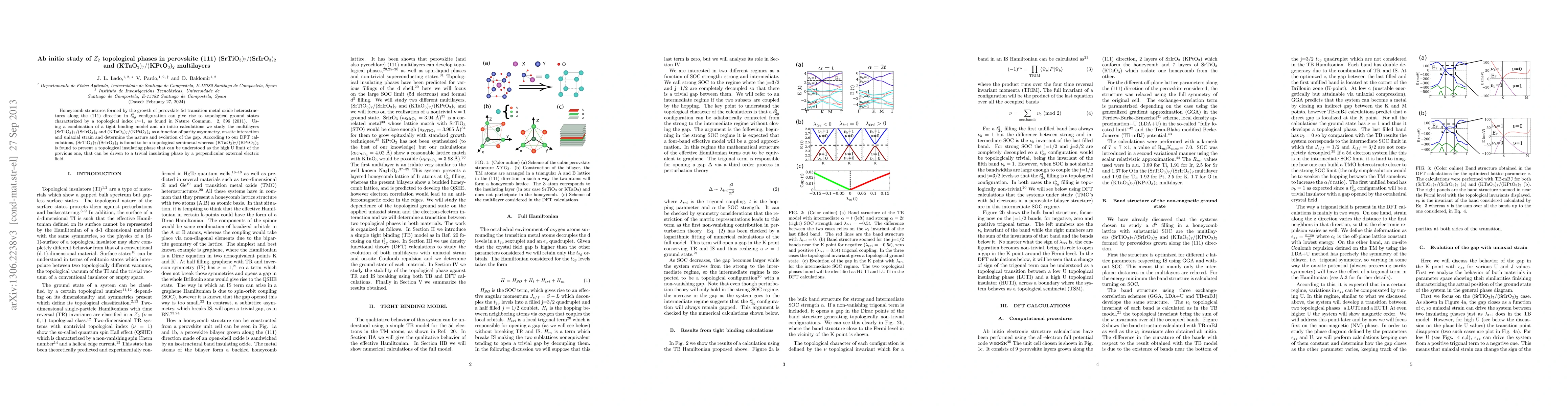 Honeycomb structures formed by the growth of perovskite 5d transition metal oxide heteroestructures along the (111) direction in $t_{2g}^5$ configuration can give rise to topological ground states characterized by a topological index $\nu$=1. Using a combination of a tight binding model and ab initio calculations we study the multilayers $(\text{SrTiO}_3)_7/(\text{SrIrO}_3)_2$ and $(\text{KTaO}_3)_7/(\text{KPtO}_3)_2$ as a function of parity asymmetry, on-site interaction and uniaxial strain and determine the nature and evolution of the gap. $(\text{SrTiO}_3)_7/(\text{SrIrO}_3)_2$ is found to be a topological semimetal. $(\text{KTaO}_3)_7/(\text{KPtO}_3)_2$ is a topological Mott insulator that can be driven to a trivial insulating phase by an external electric field.
