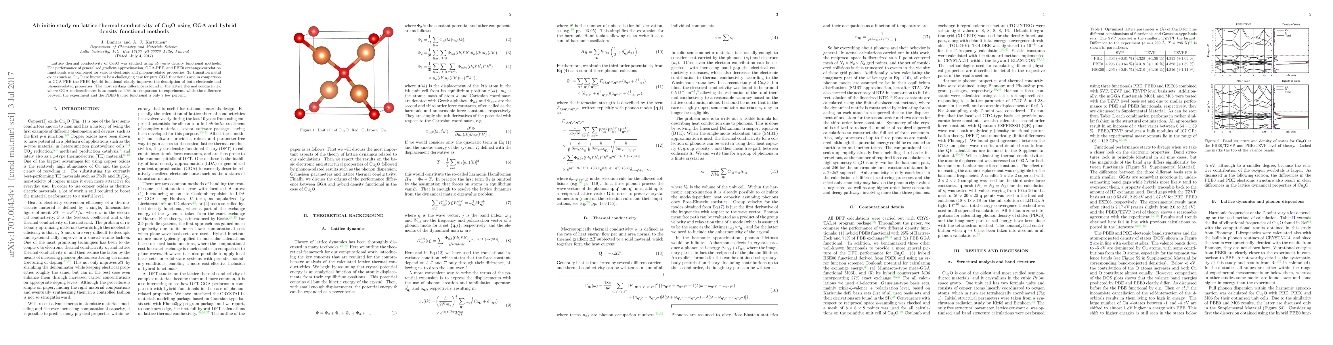 Lattice thermal conductivity of Cu$_2$O was studied using ab initio density functional methods. The performance of generalized gradient approximation, GGA-PBE, and PBE0 exchange-correlation functionals was compared for various electronic and phonon-related properties. 3d transition metal oxides such as Cu$_2$O are known to be a challenging case for pure GGA functionals and in comparison to GGA-PBE the PBE0 hybrid functional clearly improves the description of both electronic and phonon-related properties. The most striking difference is found in the lattice thermal conductivity, where GGA underestimates it as much as 40% in comparison to experiment, while the difference between the experiment and the PBE0 hybrid functional is only a few percent.