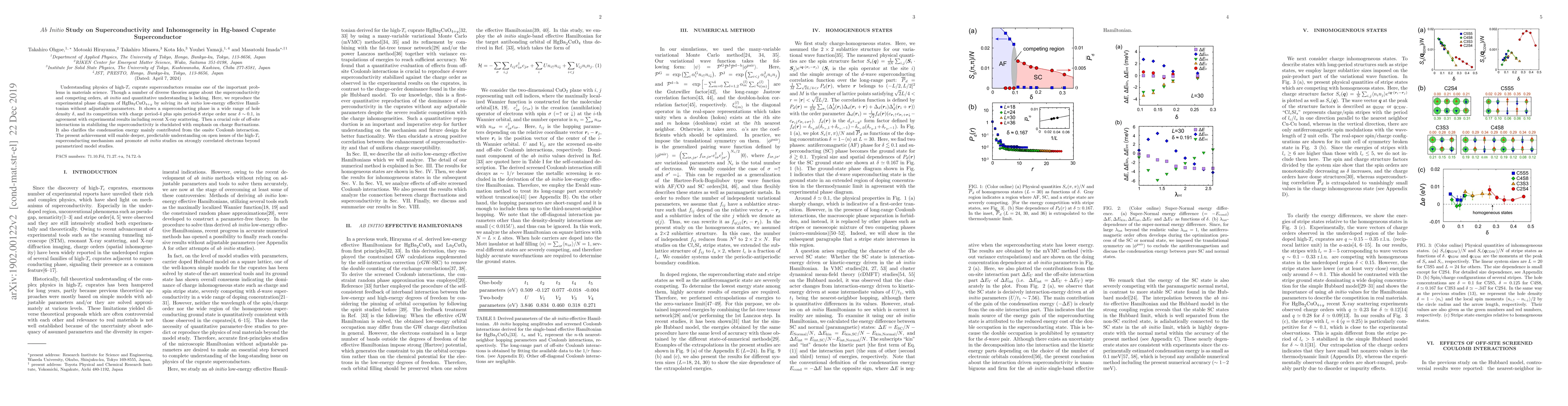 This study uses ab initio methods to reproduce the phase diagram of HgBa$_2$CuO$_{4+y}$ superconductors, revealing a superconducting phase and its competition with charge-spin stripe orders, emphasizing the role of off-site interactions and charge fluctuations in stabilizing superconductivity. The findings provide a deeper, predictive understanding of high-$T_c$ superconductivity mechanisms.